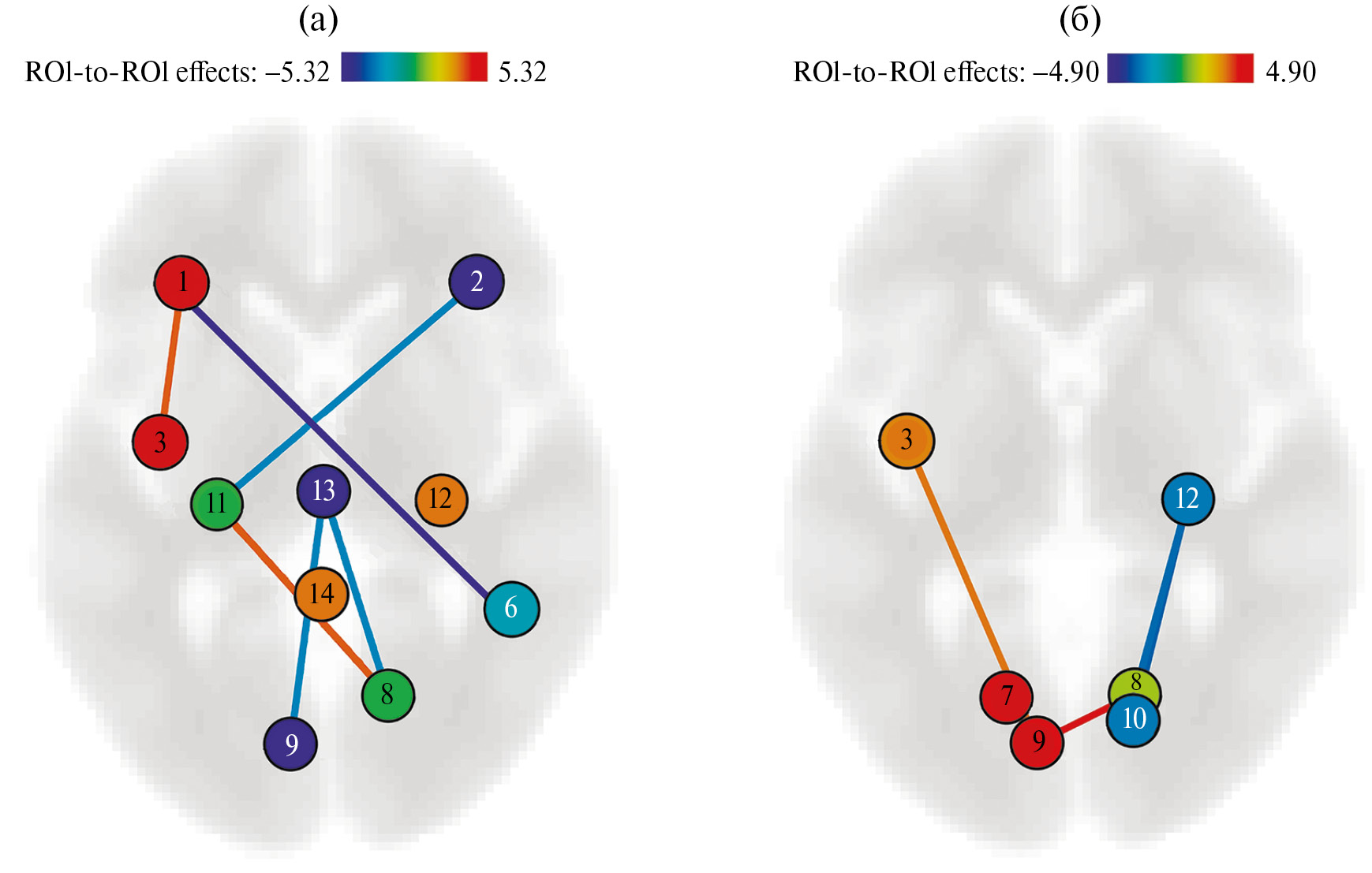 Рис. 4. Значимые изменения коннективности сети управляющих функций фМРТ покоя у пациентов с опухолевым поражением медиобазальных отделов височной доли после РТ по сравнению с состоянием до лечения. (а) – левополушарное поражение, (б) – правополушарное. Красные линии – усиление коннективности, синие – снижение после РТ при р < 0.05. Зоны интереса для расчета коннективностей представлены на рис 1.