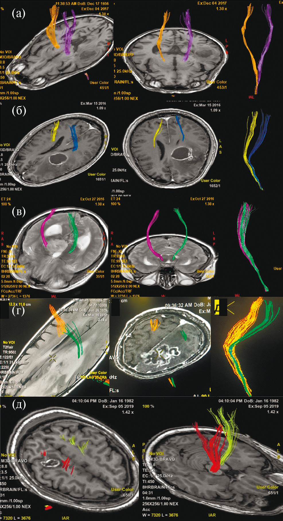 Рис. 1. (а) – пример интактного КСТ по данным ДТ-трактографии у пациента с глиобластомой. Тракты симметрично расположены и не отличаются значимо по объему. (б) – пример смещенного КСТ, по данным ДТ-трактографии у пациента с глиобластомой. Тракты не вовлечены в опухоль, однако положение их отличается. (в) – пример инфильрированного КСТ, по данным ДТ-трактографии у пациента с глиомой Grade IV. Несмотря на вовлечение КСТ в опухоль, по данным Т2-FLAIR отмечается правильное, симметричное положение тракта. (г) – пример смещенного и инфильтрированного КСТ, по данным ДТ-трактографии у пациента с глиобластомой. Тракты расположены асимметрично и вовлечены в зону отека-инфильтрации. (д) – пример расщепленного тракта у пациента с анапластической астроцитомой. Опухоль располагается внутри КСТ, расщепляя его волокна.