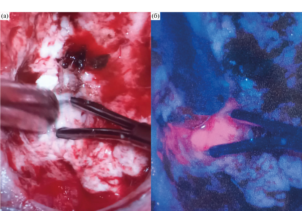 Рис. 2. (а) – интраоперационная фотография ложа удаленной опухоли у пациента с глиобластомой левой лобной доли в «белом свете». Визуально определяется неизмененное мозговое вещество, при прямой субкортикальной биполярной и монополярной стимуляции с пороговой силой тока 5 мА в этой области получены моторные ответы с языка. (б) – интраоперационноая фотография той же области. В зоне стимуляции определяется яркая розовая флуоресценция, что свидетельствует о наличии опухолевой ткани. У данного пациента резекция была остановлена.