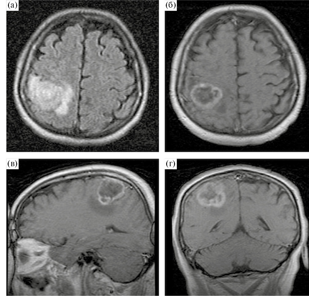 Рис. 3. МРТ до операции. Внутримозговая опухоль правой теменной доли, прилегающая к прецентральной извилине. Опухоль кольцевидно накапливает контрастный препарат и окружена небольшой зоной отека-инфильтрации. (а) – аксиальная проекция, Т2-FLAIR, (б) – аксиальная проекция, Т1 + С, (в) – сагиттальная проекция, Т1 + С; (г) – фронтальная проекция, Т1 + С.