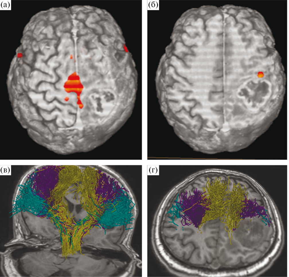 Рис. 4. МРТ у пациента с внутримозговой опухолью правой теменной доли. (а, б) – данные фМРТ; (а) – оранжевым цветом обозначена корковая зона ноги, располагающаяся вовнутрь и на некотором отдалении от медиальной границы опухоли; (б) – представлена зона руки, прилегающая к переднему краю опухоли; (в, г) – данные МР-трактографии (CSD HARDI), использованный алгоритм построения позволил построить и разделить волокна КСТ, иннервирующие ногу (горчичный цвет), руку (фиолетовый), лицо (зеленый). Волокна КСТ прилегают к медиальному и переднему краям опухоли.