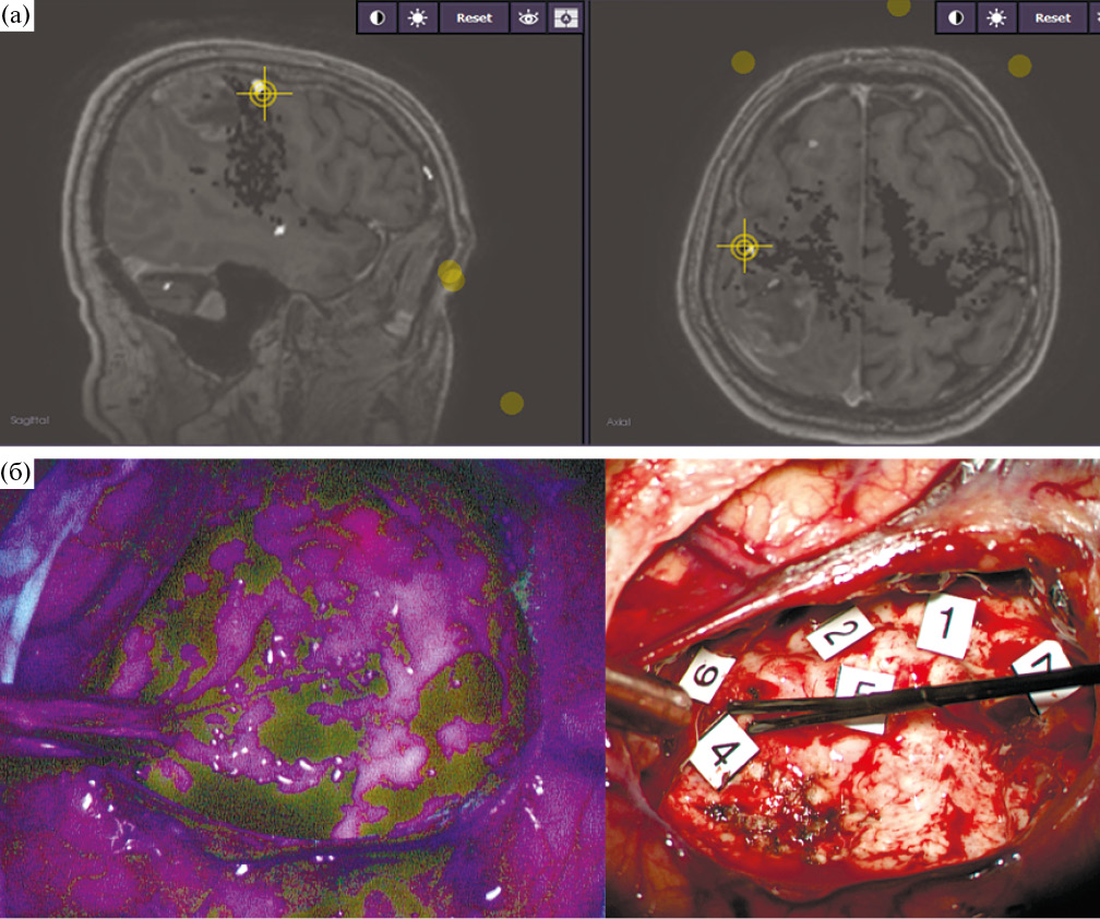 Рис. 5. (а) – интраоперационная фотография монитора навигационной системы FIAGON. Маркером отмечена точка, при стимуляции которой получены положительные моторные ответы с мышц кисти. Данная точка соответствует в данном случае моторной коре. (б) – интраоперационная фотография ложа удаленной опухоли в режиме флуоресценции и в «белом свете». Маркерами отмечены точки, при субкортикальной стимуляции которых получены положительные моторные ответы. Видно, что в «белом свете» ложе опухоли представлено нормальной мозговой тканью. В режиме флуоресценции отмечается фокальное розовое свечение (соответствующее т. 1). Данный участок оставлен во избежание нарастания моторного дефицита.