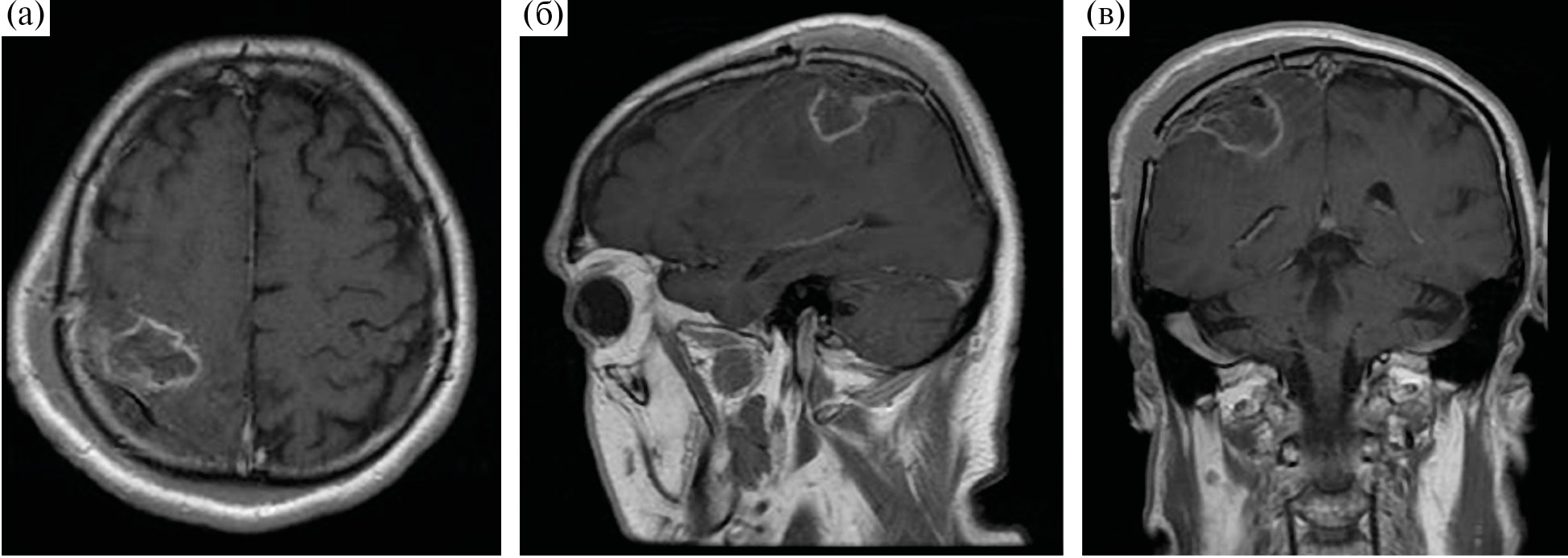 Рис. 6. Контрольная МРТ у пациента после микрохирургического удаления глиобластомы правой теменной доли, режим Т1 + С. (а) – аксиальная проекция; (б) – сагиттальная проекция; (в) – фронтальная проекция.