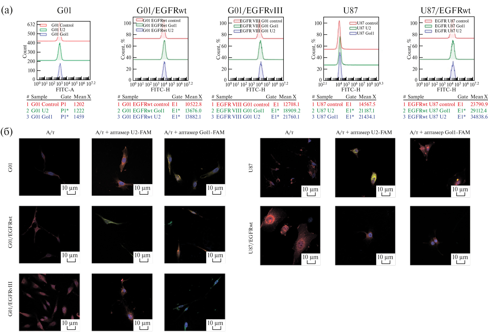 Клетки U87, G01, U87/EGFRwt, G01/EGFRwt и G01/EGFRvIII плотностью 5 × 105 были диссоциированы и осаждены центрифугированием 5 мин при 1000 g. Промытый фосфатно-солевым буфером осадок клеток разделили на 3 пробирки: контроль, клетки с добавлением U2, клетки с добавлением Gol1. Инкубацию клеток с аптамерами, меченными FAM, в концентрации 1000 наномоль проводили в течение 30 мин при +4℃ в темноте. Далее клетки трижды промывали фосфатно-солевым буфером путем осаждения в течение 3 мин при 1000 g и последующего ресуспендирования в буферном растворе, ресуспендировали в 200 мкл буферного раствора и проводили измерение на приборе. Интенсивность флуоресценции определяли путем подсчета 10 000 событий на проточном цитометре CytoFLEX LX и ПО CytExpert (Beckman Coulter, США).