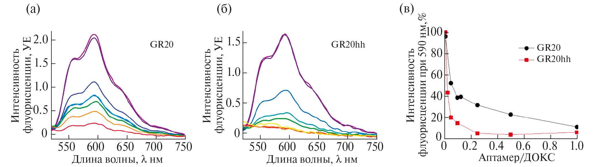 Значения максимумов флуоресценции при 590 нм пересчитывали в относительные значения связанного ДОКСа, принимая значение максимума флуоресценции для чистого ДОКСа за единицу, наносили на график зависимости относительной интенсивности флуоресценции от соотношения концентрации аптамера и ДОКСа в растворе (рис. 3 (в)). Согласно графикам, уже при соотношении 0.5:1 GR20hh по отношению к ДОКСу значение падения флуоресценции выходит на плато.