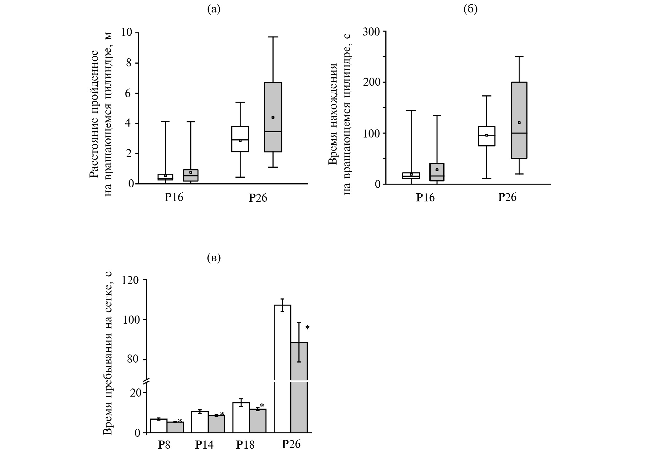 Для оценки координации движений передних, задних конечностей и равновесия на P16 и P26 использовали ротарод. Каждую крысу помещали на вращающийся стержень со скоростью вращения 5 оборотов в минуту (об/мин) и измеряли время до падения и дистанцию бега. Животных подвергали трем последовательным сеансам с интервалом 20–30 мин и регистрировали максимальное время пребывания на вращающемся цилиндре (Karl et al., 2003; Yakovleva et al., 2018).