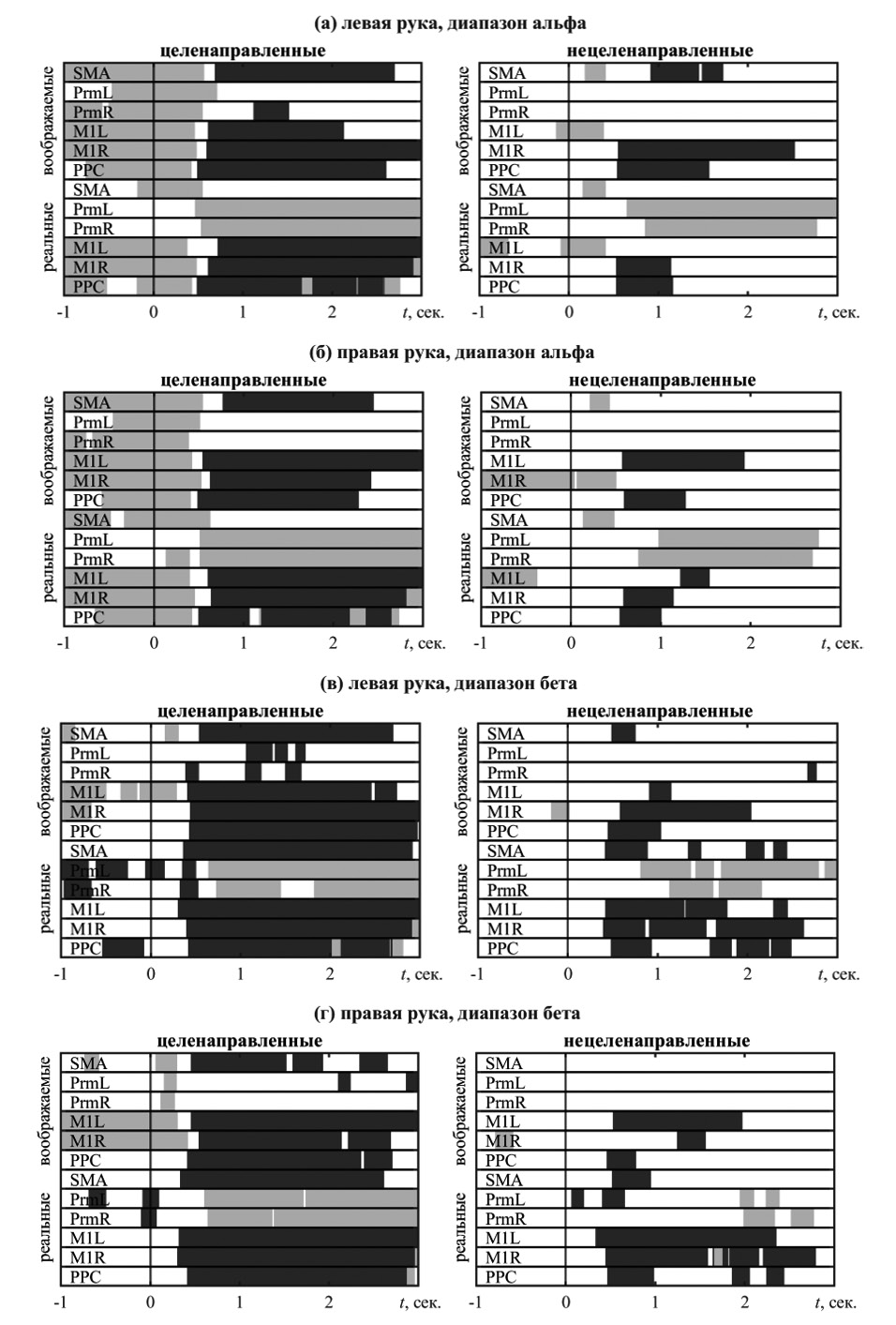 Рис. 1. Отрезки достоверной синхронизации (светло-серые) и десинхронизации (темно-серые) выделенных компонент ЭЭГ во время совершения реальных или воображаемых движений по императивному сигналу. Нулевая отметка времени соответствует императивному сигналу. Левая панель относится к целенаправленным движениям, правая – к нецеленаправленным.
