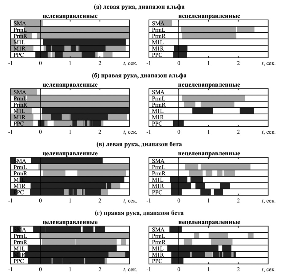Рис. 2. Отрезки достоверной синхронизации (светло-серые) и десинхронизации (темно-серые) выделенных компонент ЭЭГ во время совершения движений по императивному сигналу. Нулевая отметка времени соответствует началу движения. Левая панель относится к целенаправленным движениям, правая – к нецеленаправленным.