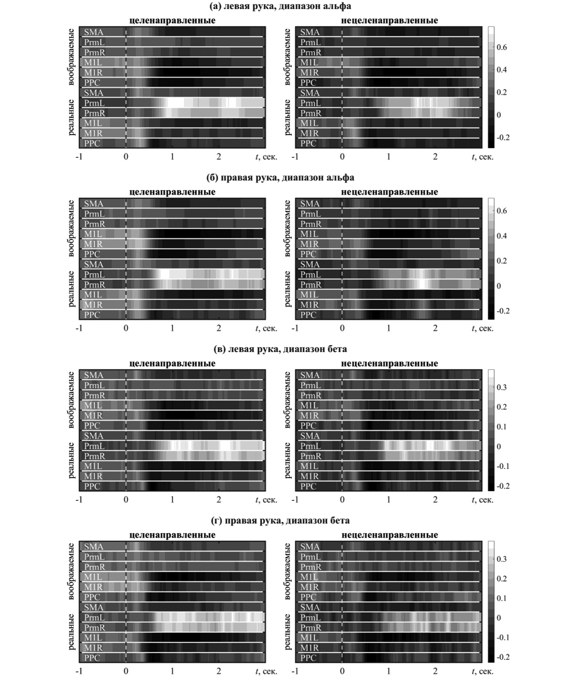 При воображении нецелевого движения (рис. 1 (в, г)) также наблюдается билатеральная и асимметричная десинхронизация М1, однако длительность десинхронизации всего 2 сек, причем десинхронизация в ипсилатеральном полушарии заканчивается еще раньше. Еще короче десинхронизация в SMA и в PPC. Десинхронизация в PrmL отсутствует. Наблюдается нестойкая десинхронизация PrmR во время воображаемого нецеленаправленного движения левой руки.