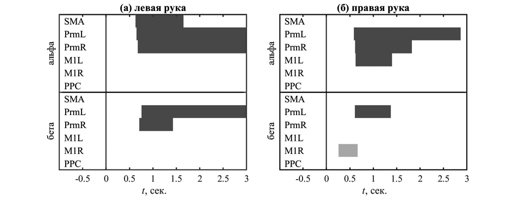 Рис. 5. Результаты теста с перестановками, сравнивающего степень (де)синхронизации активности выбранных компонент при реальном и воображаемом движении по императивному сигналу. Светло-серые полосы – подавление ритма меньше при воображаемых движениях, темно-серые – подавление ритма больше при воображаемых движениях. На всех панелях приводятся результаты только для целенаправленных движений. Левая панель относится к выполнению заданий левой рукой, правая – к выполнению заданий правой рукой.