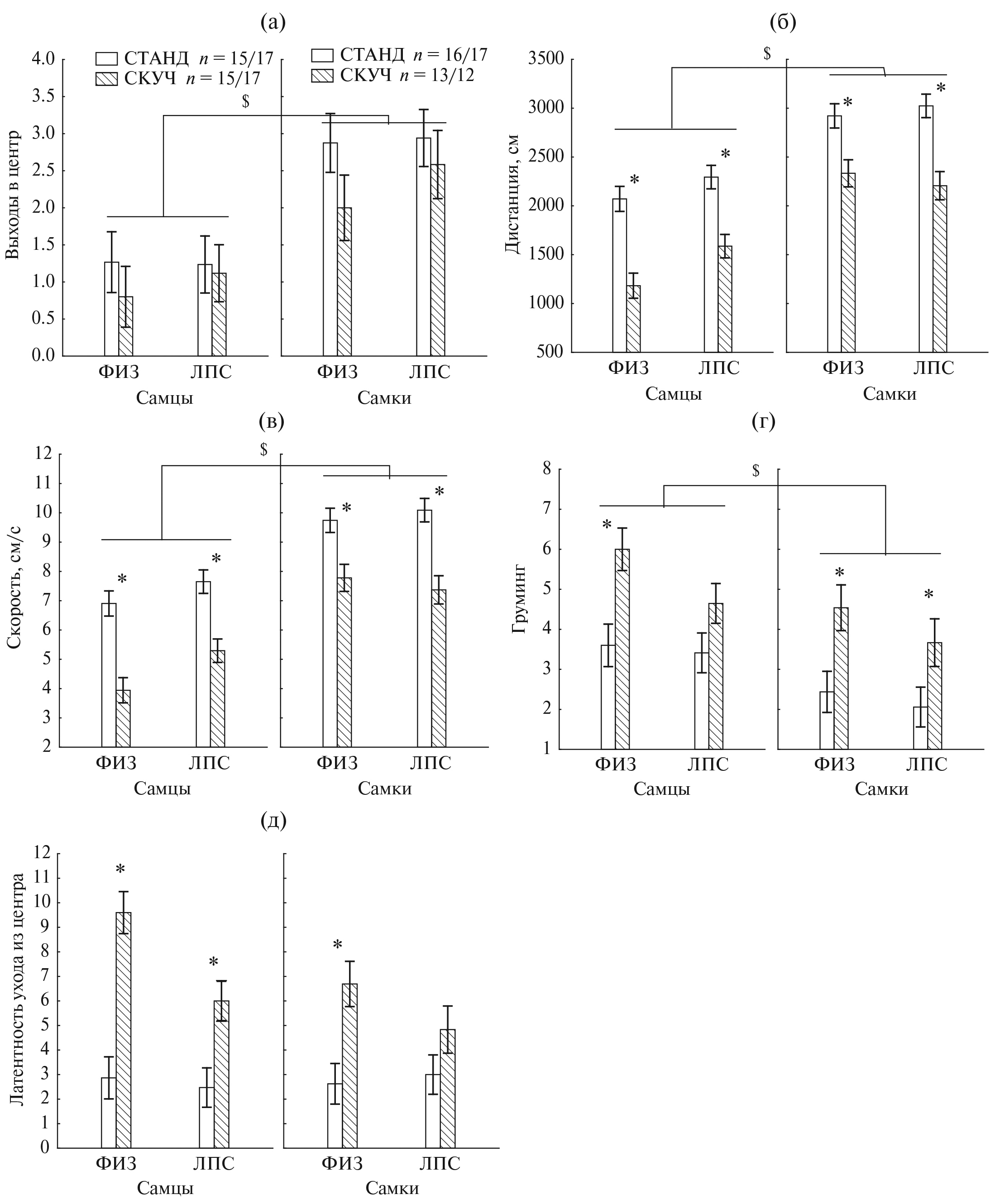 Рис. 1. Влияние содержания в скученных условиях на поведение крыс в “открытом поле”. СТАНД – группа крыс, содержащаяся в стандартных условиях, СКУЧ – крысы, проживающие в скученных условиях. ФИЗ – крысы с введением физиологического раствора в раннем онтогенезе, ЛПС – крысы с введением ЛПС. * – статистически значимые различия между группой СТАНД и СКУЧ, $ - между самцами и самками (р < 0.05, Factorial ANOVA, post hoc анализ). n – число крыс в группах ФИЗ/ЛПС.