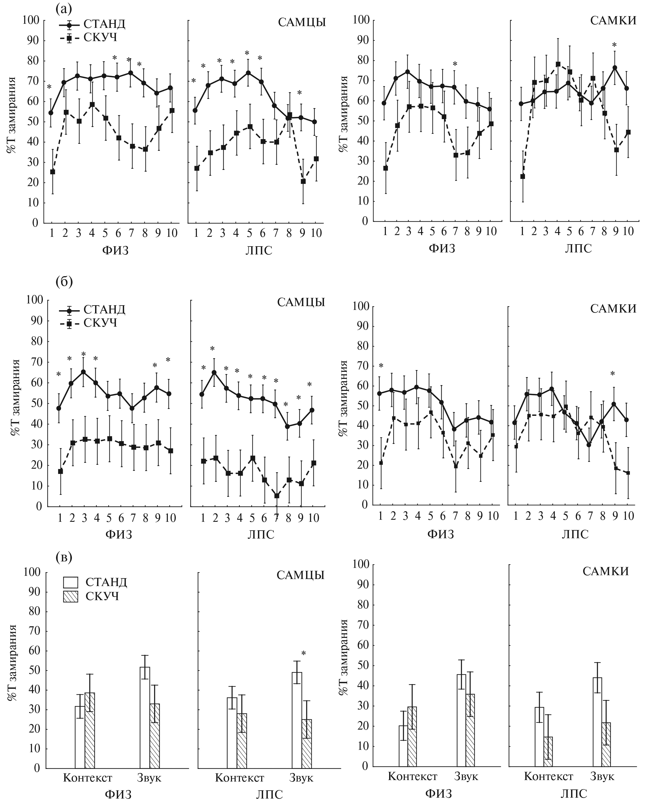 Fig. 4. The effect of housing in crowded conditions on extinction 1 (а), extinction 2 (б) and the expression of conditioned fear in Test 2 (в). On the axis of the abscissa on (а) and (б) is the number of the sound stimulus, on (в) is the presentation of the context or sound. On the ordinate axis – the percentage of freezing time. * – statistically significant differences between the СТАНД and СКУЧ group (p < 0.05, Factorial ANOVA, post hoc analysis). The remaining designations are as in Fig. 1.