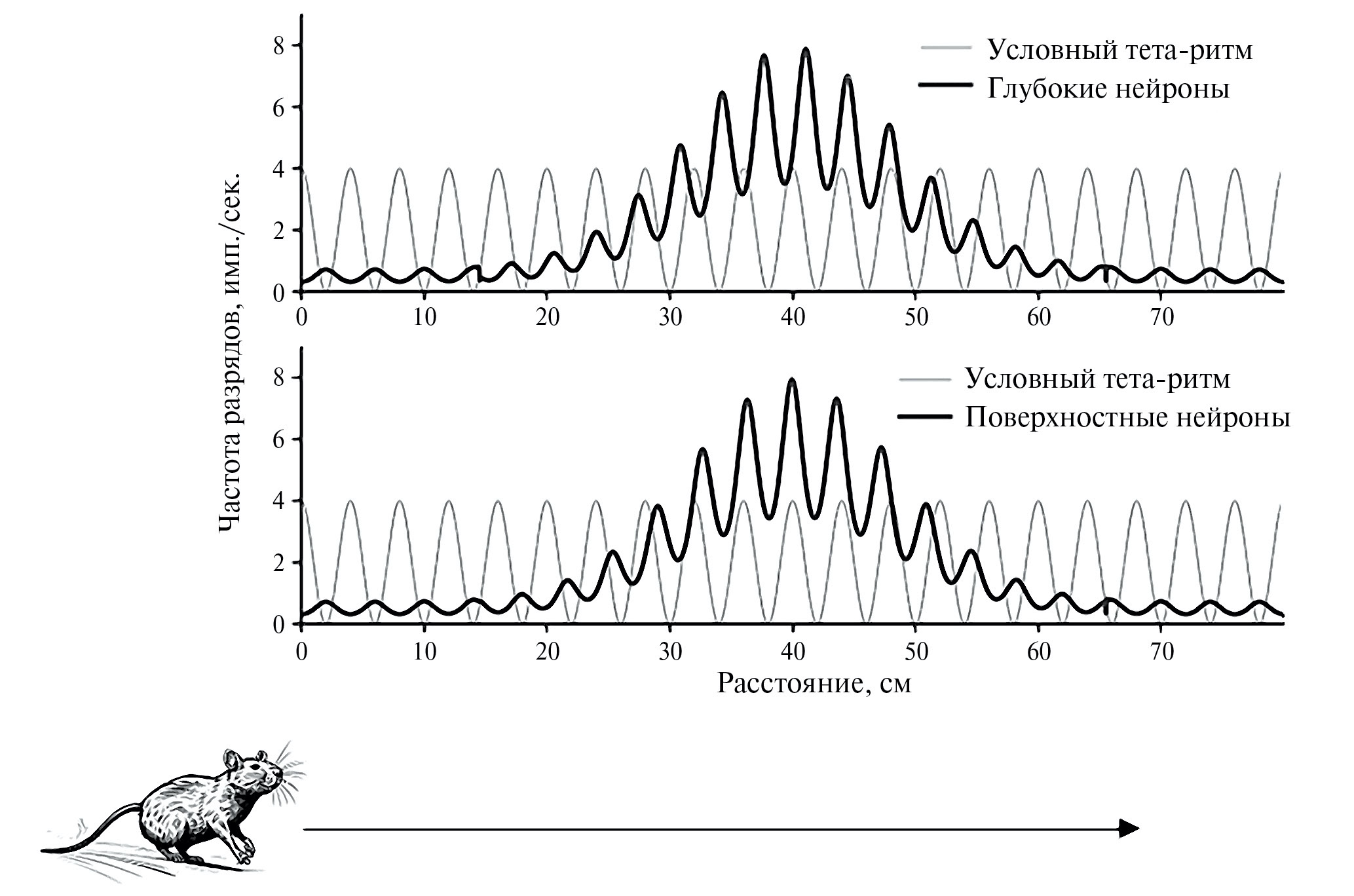Рис. 2. Пример идеализированной активности клеток места с эффектом фазовой прецессии. Показана зависимость средней частоты разрядов глубоких и поверхностных пирамидных нейронов от положения животного в пространстве. Показана привязка пирамидных нейронов к фазе тета-ритма вне поля места. На представленных графиках для глубоких и поверхностных нейронов отличаются наклон и начальная фаза прецессии: для глубоких нейронов наклон 15 0/см, начальная фаза 2700, для поверхностных нейронов наклон 8 0/см, начальная фаза 2100. Аппроксимация активности клеток места произведена на основе экспериментальных данных (Sharif et al., 2021) и (Oliva et al., 2016). Отметим, что параметры фазовой прецессии сильно варьируют при выполнении разных когнитивных тестов, приведенные параметры следует рассматривать лишь как пример одного из возможных вариантов.