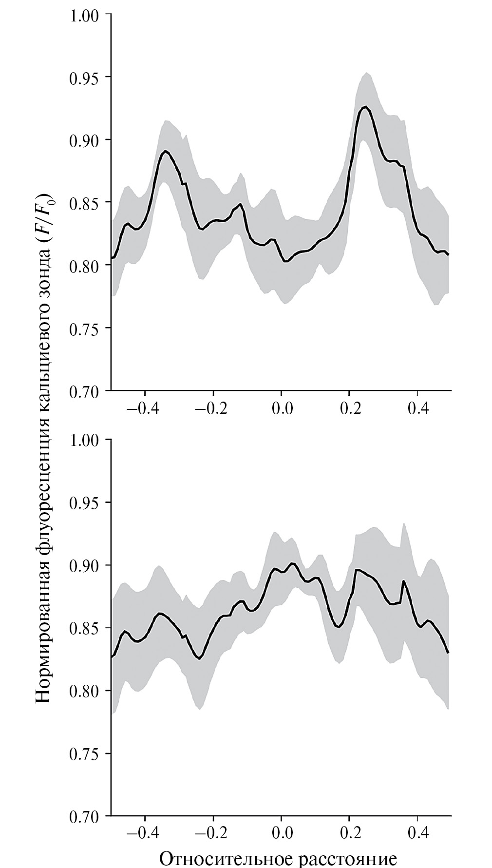 Fig. 3. The activity of interneurons while the mouse is running along a linear track (mean ± standard error of mean), aligned relative to the center of the field of the place. The size of the place field of each place cell (n = 8) was adjusted to the range from –0.5 to 0.5, the absolute values of the place fields were 33.2 ± 3.8 cm (average ± standard error of mean). The upper plot shows the dependence of the activity of presynaptic interneurons for the place cell. The lower plot shows the activity of random interneurons at the same time. Data from the article (Geller et al., 2022).