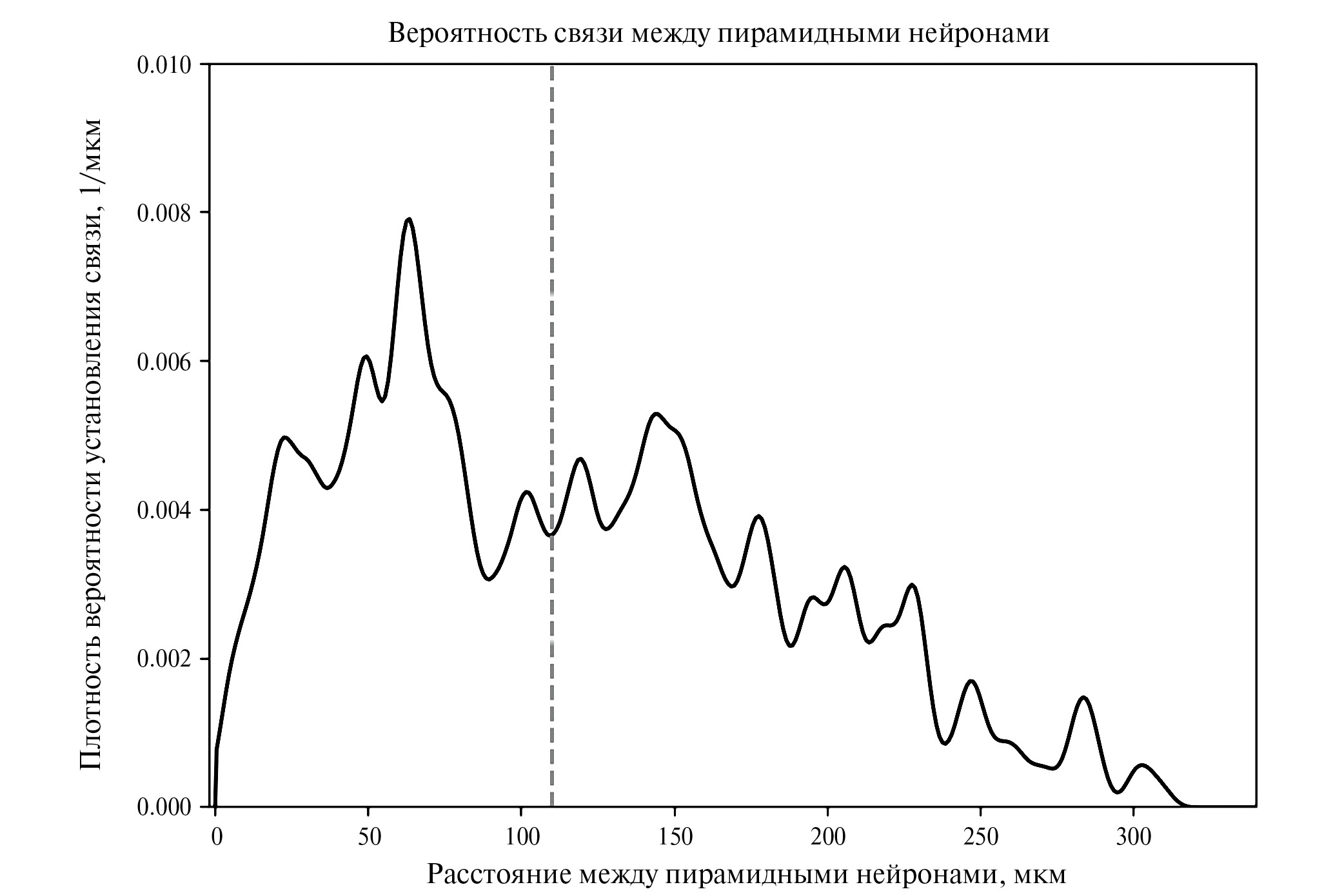 Рис. 4. Вероятность установления связи между пирамидными нейронами в поле СА1 в зависимости от расстояния между телами клеток. Штриховой линией отмечена медиана распределения 110 мкм. Данные из статьи (Geiller et al., 2022).