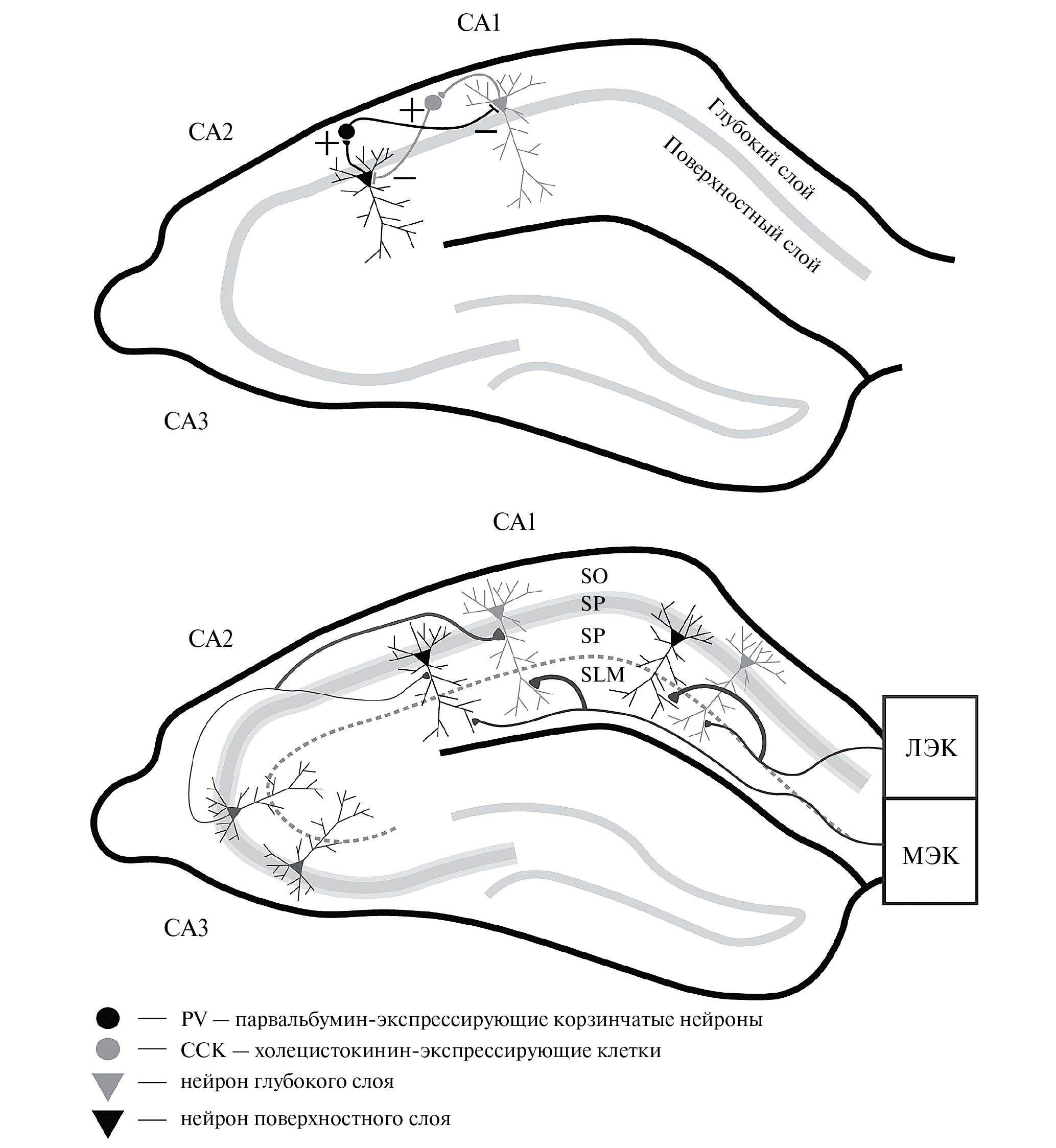 Долгое время считалось, что пирамидные нейроны анатомически и функционально однородны. Однако большой набор экспериментальных данных показывает, что пирамидные нейроны подразделяются на два подслоя (Mizuseki et al., 2011; Valero, de la Prida, 2018). Нейроны, тела которых располагаются ближе к stratum radiatum, называются поверхностными. В свою очередь нейроны, тела которых располагаются ближе к stratum lacunosum moleculare, называются глубокими (рис. 5).
