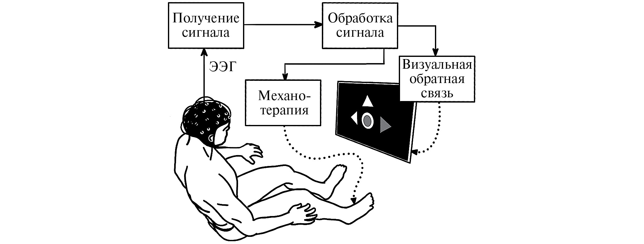 Рис. 1. Схема работы комплекса на базе нейроинтерфейса со зрительной обратной связью, дополненного механотренажером «Биокин».