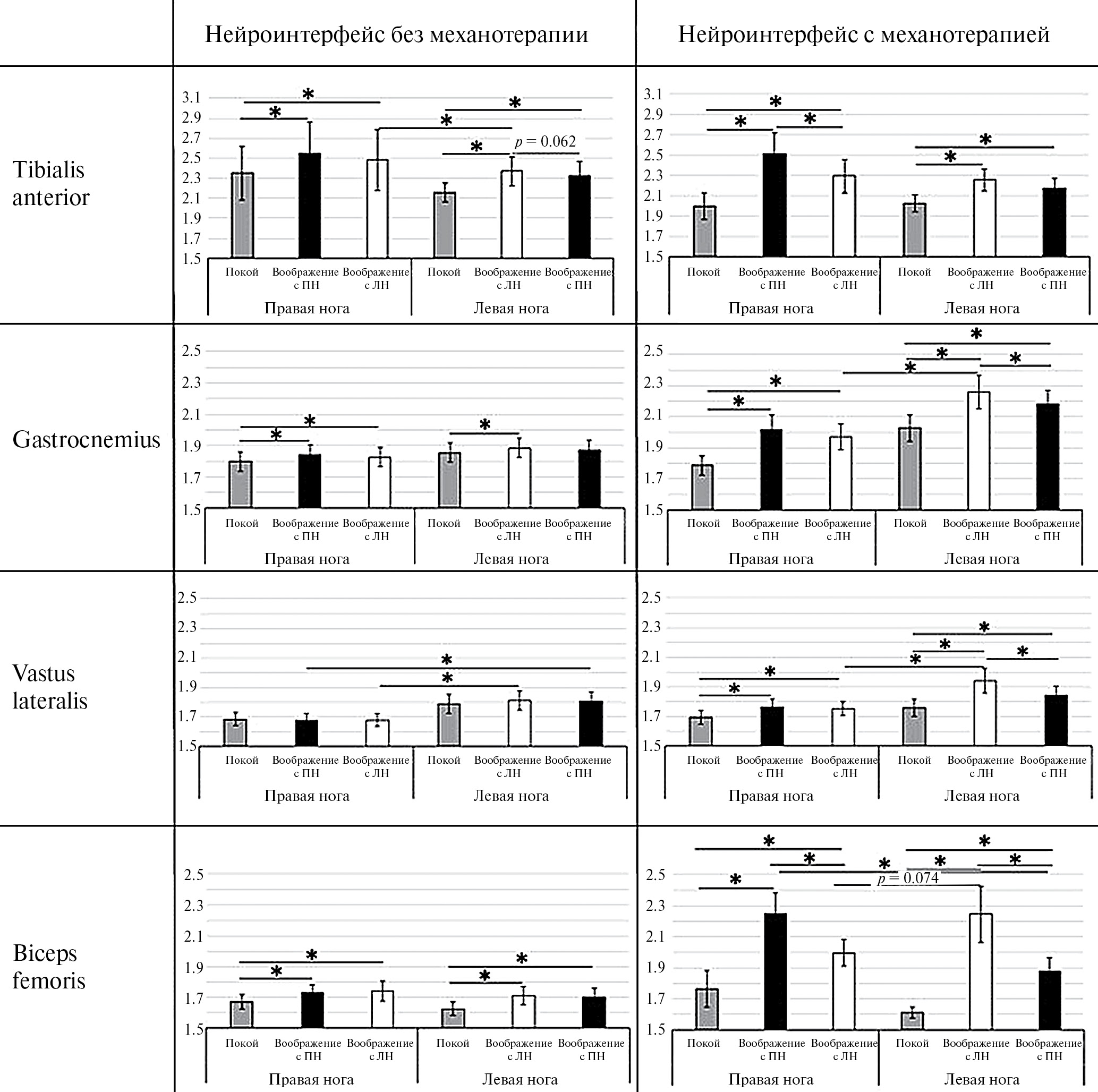 Fig. 4. Average EMG activity of the muscles (μV) of the tibialis anterior, gastrocnemius, vastus lateralis and biceps femoris on the right leg (ПН) and left one at rest (gray columns) and during motor imagery of walking beginning from ПН (black columns) or from ЛН (white columns) when controlling the neurointerface with and without activation of the mechanical training device. The asterisk (*) indicates differences between the EMG activity values that are significant when introducing the Bonferroni correction; in the case of a tendency towards significance, the p value is indicated.