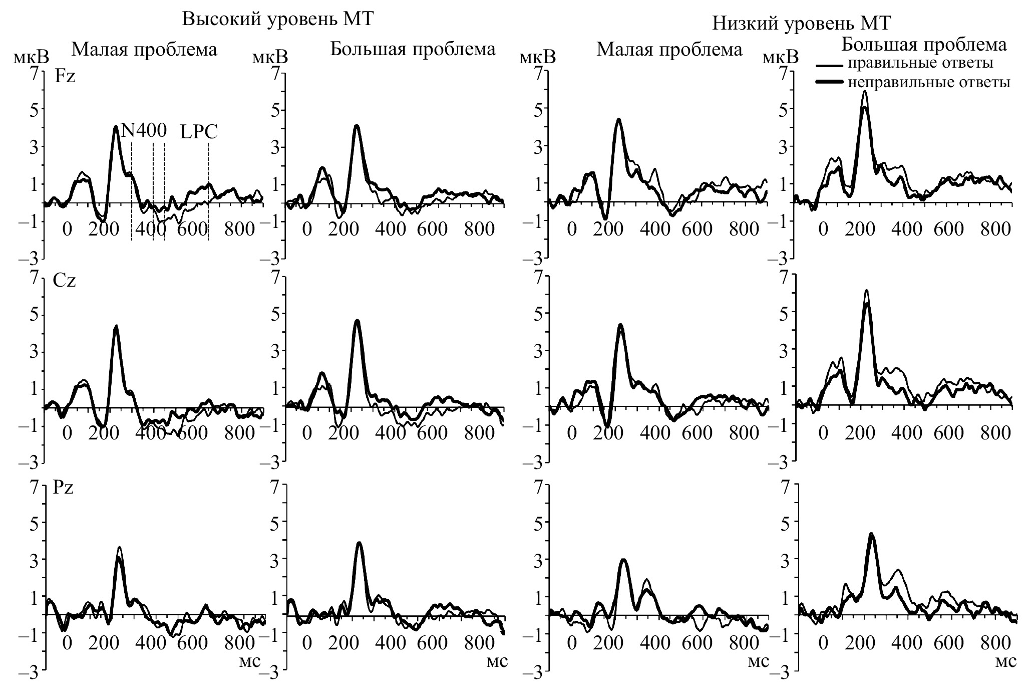 Предыдущие исследования показали, что при решении примеров на сложение двузначных чисел участники эксперимента с высоким уровнем МТ показывают меньшую амплитуду LPC при предъявлении неправильных решений по сравнению с участниками эксперимента с низким уровнем МТ (Núñez-Peña, Suárez-Pellicioni, 2015). Предполагается, что неправильные решения кажутся более правдоподобными для людей с высоким уровнем МТ, что выражается в снижении амплитуды волны LPC в ответ на их предъявление (Núñez-Peña, Suárez-Pellicioni, 2015). Авторы связывают такое отличие между двумя группами с меньшей арифметической компетенцией участников эксперимента с высоким уровнем МТ, что повторяет результаты исследований, направленных на выявление связи волны LPC с арифметическим навыком (Núñez-Peña и Suárez-Pellicioni, 2012).