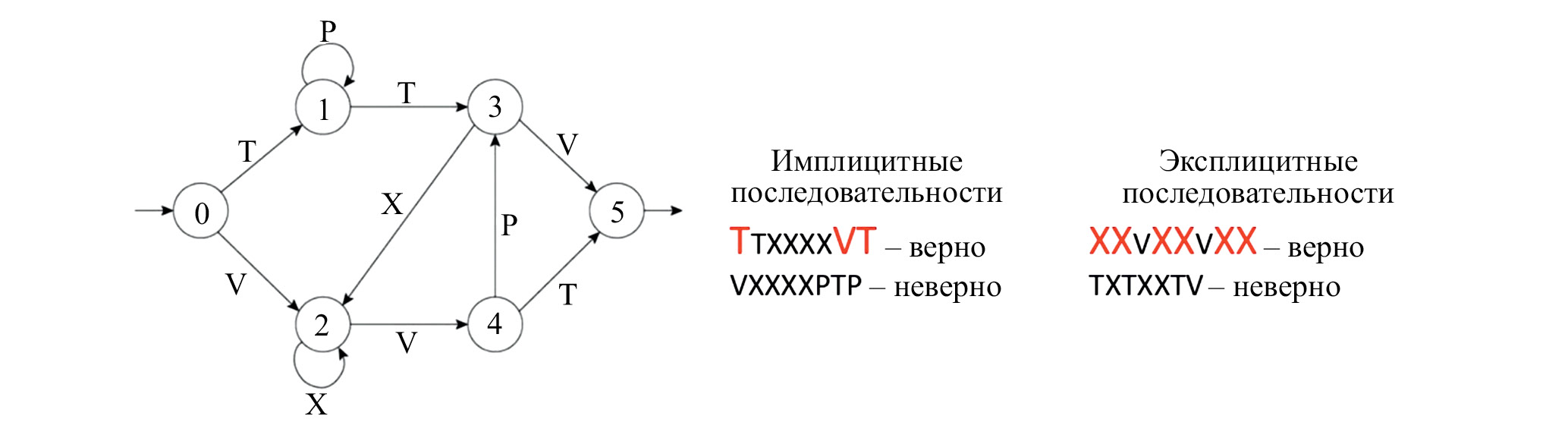 Рис. 1. Схема составления и примеры имплицитных буквенных рядов (Reber, 1967).