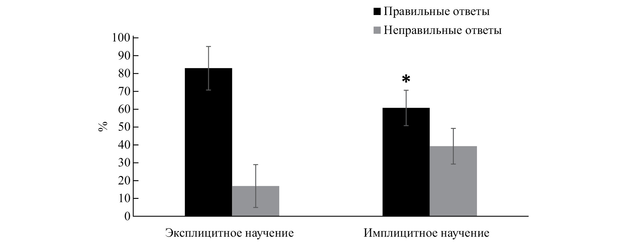 Рис. 2. Процент правильных и неправильных ответов при различных видах научения. Примечания: * – p < 0.05 – обозначены достоверные отличия от эксплицитного научения.