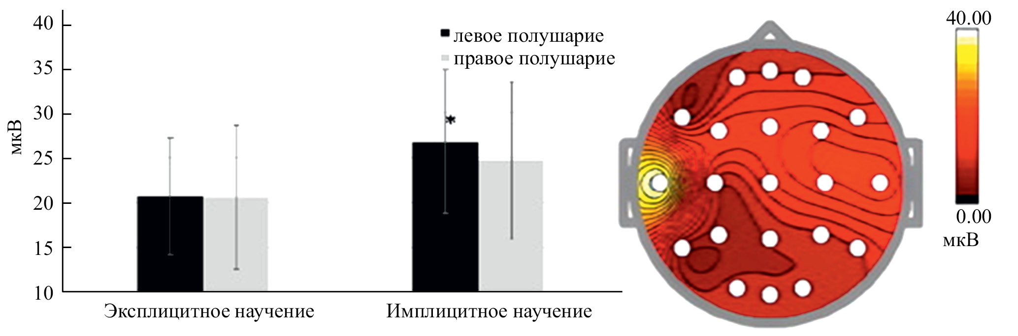Прямые сравнения амплитудного спектра ЭЭГ-активности в процессе освоения различных видов научения показывают, что для имплицитного научения характерна повышенная амплитуда в диапазоне θ ритма, наиболее выраженная в передне-височных областях коры левого полушария (рис. 3).