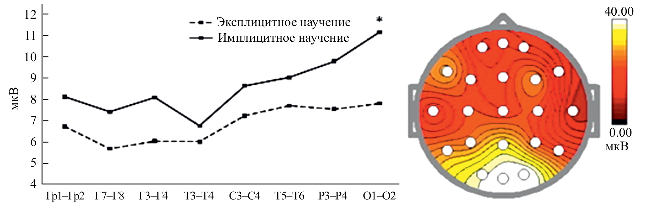 Оценку параметров амплитуды ЭЭГ при имплицитном научении проводили в сравнении с традиционным статистическим (эксплицитным) научением, для чего использовали буквенные последовательности с очевидными закономерностями.