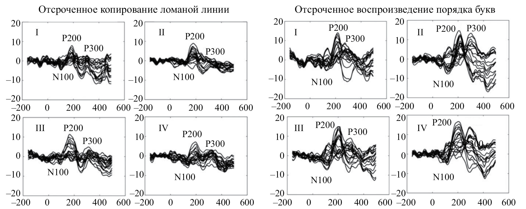 Рис. 2. Суперпозиция ССП в 20 псевдоотведениях в ответ на императивный сигнал при отсроченном копировании ломаной линии и воспроизведении порядка букв в последовательности: I, III – задержка 500 мс; II, IV – задержка 3000 мс; I, II – статический режим; III, IV – динамический режим