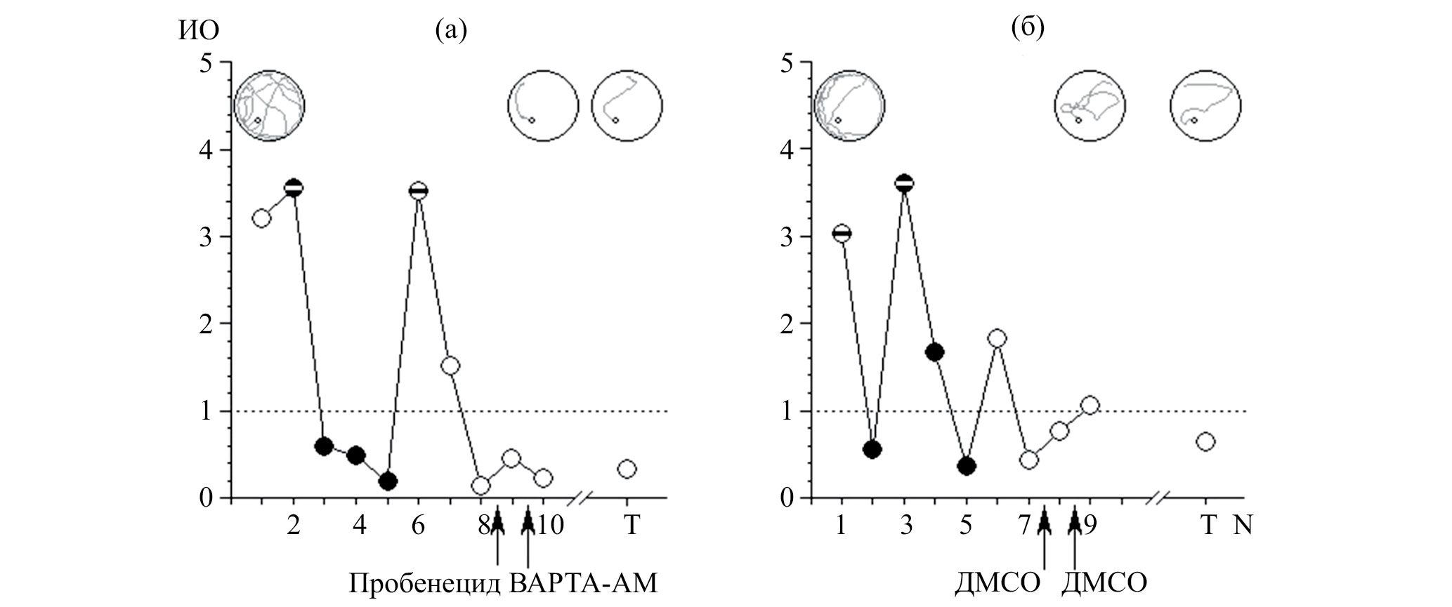 Fig. 1. Dynamic of individual learning in Morris water maze and recall of memory in experiment (a) and control (б). N – number of trial; 1 – first trial (test for physical condition of the animal); rest trials – learning; T – memory test 7 days later. ИО – index of learning. Dotted line – ИО=1 (ИО<=1 means that the rat had learned the task). Black circle – visible platform, white one – invisible platform; “–” in the circle means that the rat didn’t find the platform in particular trial, empty circle – the animal had found the platform. Arrows – intraperitoneal injections. Trajectories of swimming are shown above: experiment (trials 1, 10, T), control (trials 1, 9, T). For more details see the text.