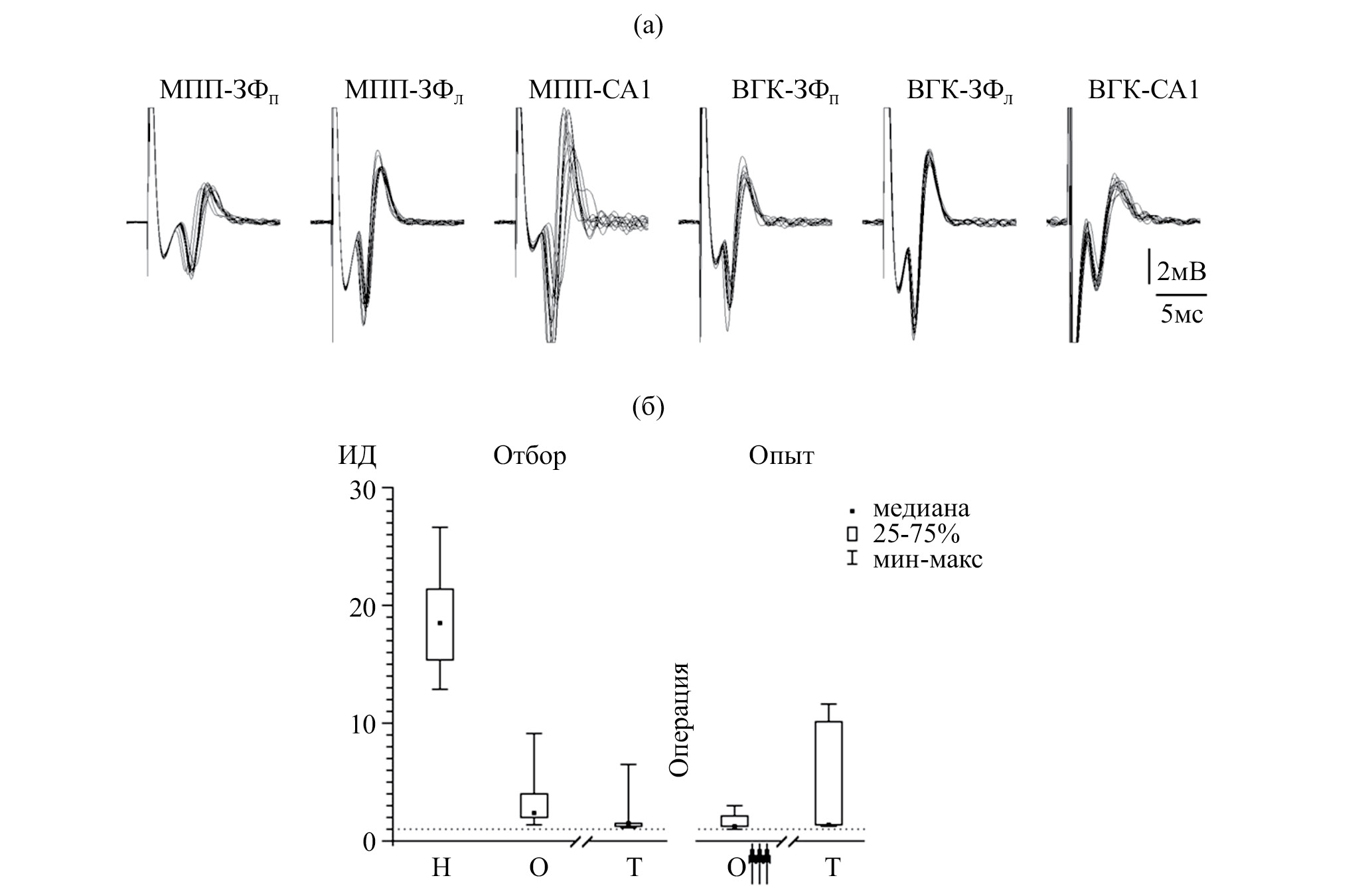На рис. 4 (а) показаны примеры ответов нейронов ЗФ и поля CA1 гиппокампа на стимуляцию ВГК и МПП. Диапазон усредненных значений (n = 5) амплитуд вызванных ипси- и контрлатеральных ответов (популяционных спайков) трех структур ГФ в зависимости от расположения стимулирующих и регистрирующих электродов у 5 экспериментальных животных составил: МПП-ЗФипси (от 0.57 ± 0.17 до 7.27 ± 0.10 мВ); МПП-ЗФконтр (от 0.33 ± 0.06 до 0.64 ± 0.46 мВ); МПП-СА1 (от 0.37 ± 0.03 до 5.67 ± 1.38 мВ); ВГК-ЗФипси (от 4.68 ± 0.61 до 5.06 ± 0.44 мВ); ВГК-ЗФконтр (от 3.93 ± 0.65 до 5.72 ± 0.62 мВ); ВГК-СА1 (от 3.10 ± 0.37 до 3.54 ± 0.39 мВ).