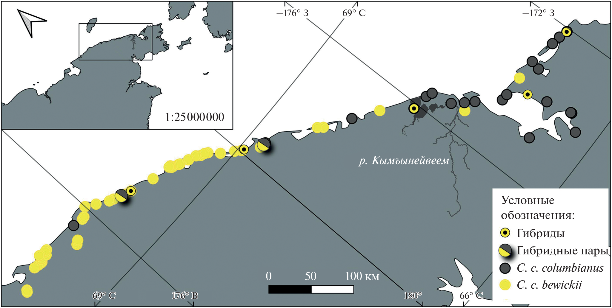 The tundra of the eastern Asian Arctic is inhabited by at least three flyway populations of the Tundra swan: the East Asian continental migratory flyway population of C. c. bewickii; the western Pacific flyway population of C. c. bewickii, and the western (American) flyway population of C. c. columbianus. The main objective of the present paper is to assess population trends by comparing information on the historical (the only one in the tundra of northeastern Asia) bird aerial survey in 1993–1995 with the data of our aerial survey held in 2020–2021. Another aim was to estimate the proportion of breeding birds in different flyway populations. The size of the zone of intergradation C. c. bewickii and C. c. columbianus in Chukotka and the level of hybridization have so far remained poorly studied, this issue required clarification. Aerial survey data for 2020–2021 were processed using QantumGIS 9.16.5 software. The system included the following layers: a vector layer of the world map; routes of aerial surveys for 2020 and 2021; and polygons of counts for 1993–1995. The system made it possible to calculate the length of the survey. Estimates for each region were calculated for the extrapolation area given in the historical survey. Between 1993–1995 and 2020–2021, an increase in the numbers of all three flyway populations of the Tundra swan was revealed on the breeding grounds. The East Asian continental flyway population increased 3.86 times, vs. 3.05 times for the West Pacific flyway population (while the documented growth of this population was 2.1 times, according to mid-winter counts over the same period). The Western (American) flyway population grew 2.5 times. We believe that the northern border of the summer range of the Tundra swan has significantly shifted to the north, following the summer climate change and the northward shift of the subarctic tundra zone. Registration of nests and broods in areas where only non-breeding birds were recorded during the historical survey is additional evidence of a northward displacement of the range. Kymyneyveem R (about 175.6° W) borders the areas of dominance of C. c. bewickii and C. c. columbianus. The switch in dominance has been triggered off, as there is no zone where both subspecies would occur in equal proportions. The overlap area of both subspecies extends for 600 km along the Arctic coast.