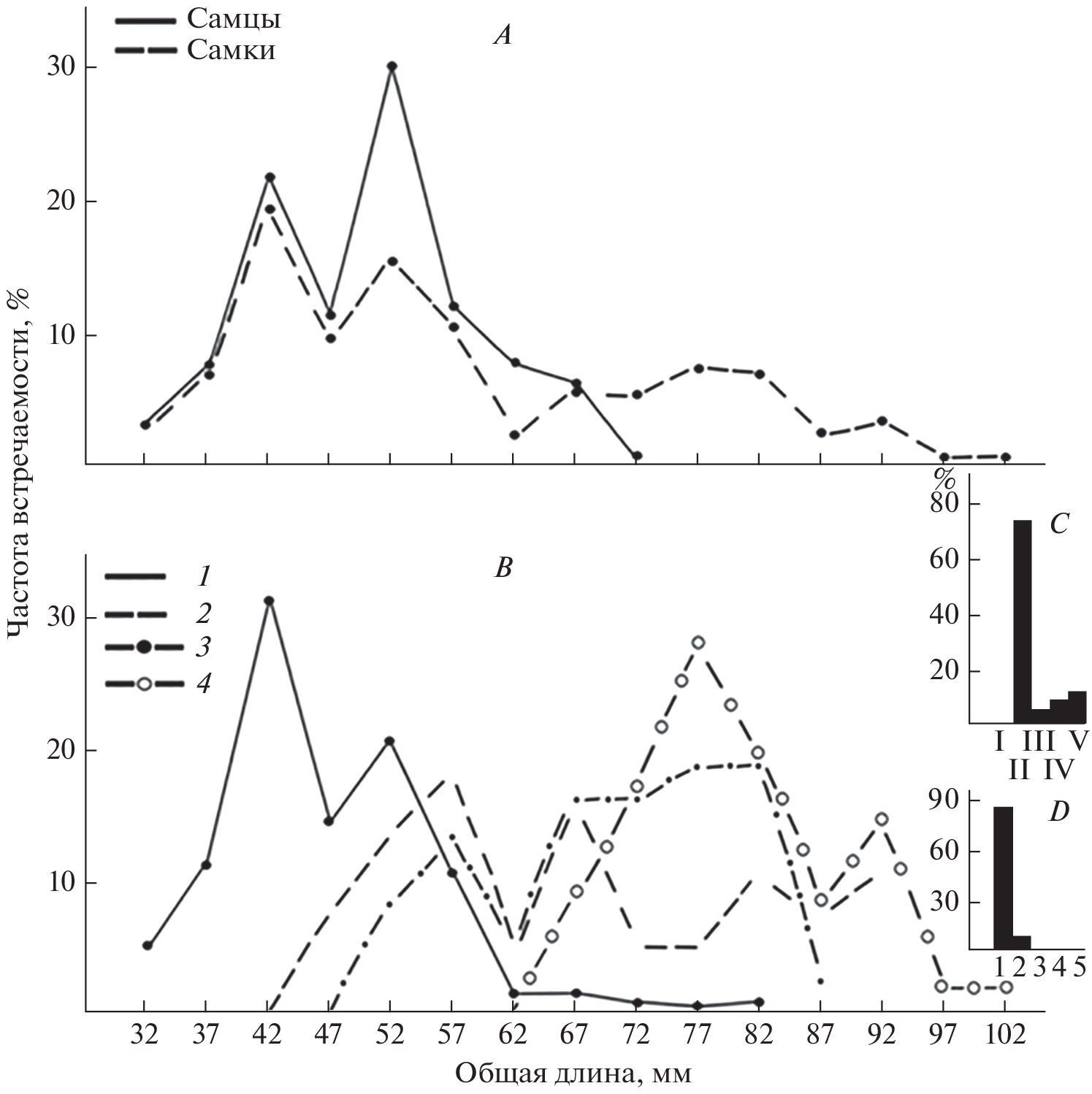 The size and sex structure, the dependence of the state of the gonads of females on the size of the individual, and the composition of the food of the shrimp, Sabinea septemcarinata (Sabine 1824) (Crustacea, Crangonidae) from the Laptev Sea, the Khatanga Bay and the Kara Sea are described (598 individuals: 230 of them had empty stomachs, 368 contained food in their stomachs, and 34 had them full). The shrimps were collected in August–September 2016. The total body length of the shrimps examined varied from 31 to 103 mm: 32–103 mm in females and 31–74 mm in males. The lifespan seems to last 3–4 years in females, vs 2–3 years in males. Based on the condition of the gonads of the females, the time of material collection coincided with spawning. Among the females there are individuals at all stages of the reproductive cycle: feeding, spawning and preparing for the next spawning. This indicates extended population spawning. Sabinea septemcarinata belongs to the life form of burrowing shrimp. According to the frequency of occurrence in the stomachs, detritus takes the first place (92.2%). The second and third places are taken up by cumin crayfish and sedentary polychaetes, which occur in almost every second and third stomach (frequency of occurrence 37.7 and 23.9%, respectively). Sand shows a frequency of occurrence of 50.3%. In the virtual food lump, a little more than a third of its volume is taken up by detritus (39.7%), followed by cumin crayfish and polychaetes that take second and third places (23.6 and 22.6%, respectively). Consequently, S. septemcarinata feed on infauna. Thus, S. septemcarinata are characterized by elements of an attacking predator and a detritophage.