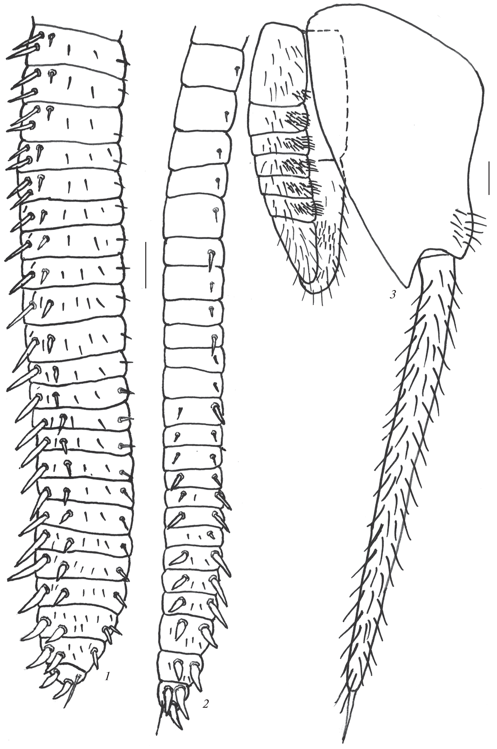 Two new species from the bristletai family Machilidae are described from Tajikistan, Central Asia: Allopsontus sogdianus sp. n. and Silvestrichilis perfectus sp. n. Allopsontus sogdianus sp. n. seems to be particularly similar to A. pulchellus (Kaplin 1982), a species of the subgenus Anisopsontus from the Dzhungarsky Alatau Mountains, southeastern Kazakhstan, as their males share many small, dark, specialized bristles on the ventral surface of articles 2–7 of the maxillary palps. Allopsontus sogdianus sp. n. differs from A. pulchellus by the length of the body, the structure of the antennae, the number of articles in the distal parts of the antennae, the color and structure of the eyes and paired ocelli, the maxillary palps, the sensory field on the femora of the male forelegs, the relative length of the styli on the males and females urites VIII and IX, the number of articles of the ovipositor and male parameres. Males of Silvestrichilis perfectus sp. n. are with 4–5 almost vertical, thickened, needle-like bristles on the second articles of the fore, middle and hind tarsi, this being one of the main morphological features of this genus. Silvestrichilis perfectus sp. n. differs from other species of the genus first of all by the presence of sensory fields on the fore and middle femora of males.