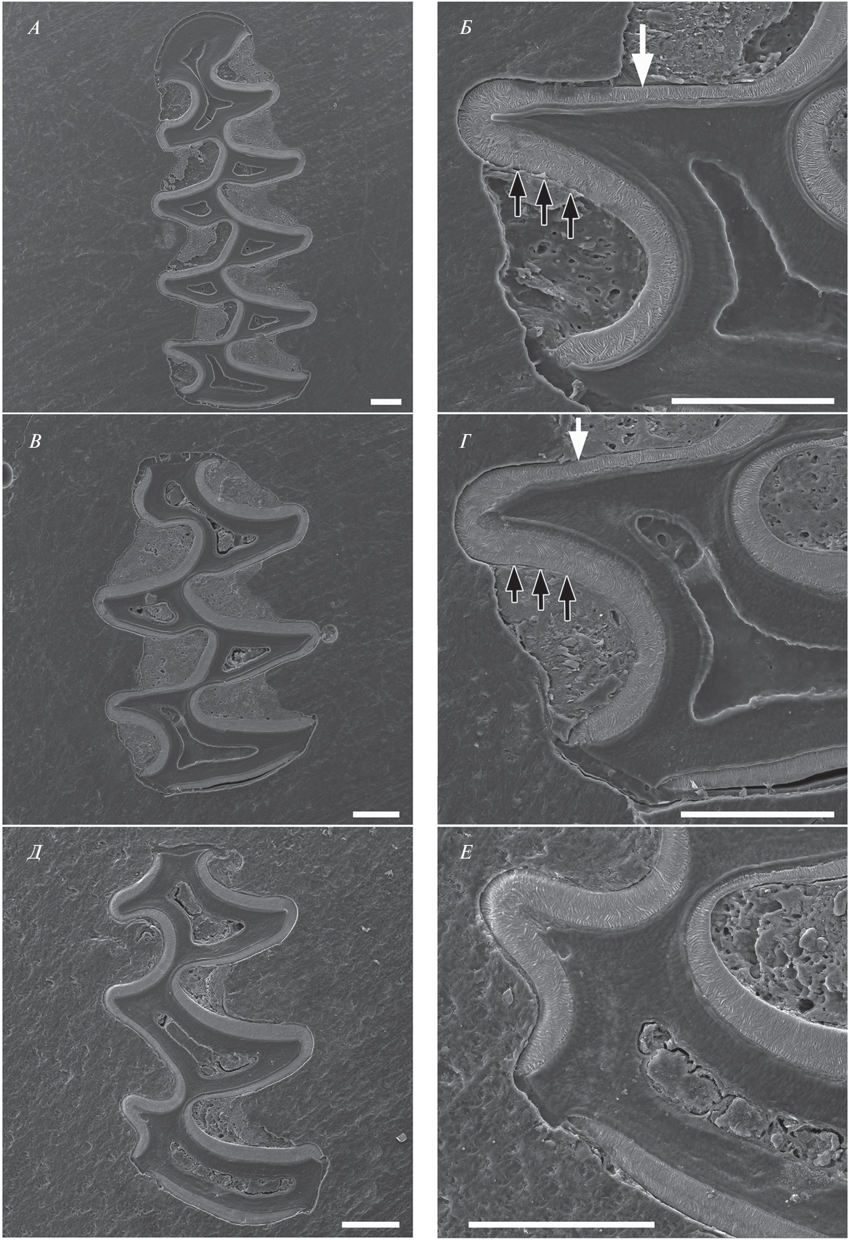 Восточноевропейская полевка – факультативно синантропный вид, активно расселяющийся в восточной части северной Евразии. Территория распространения вида в Иркутской области известна как дизъюнктивный участок ареала с 1980-х. Изучено 98 особей, отловленных в 2016–2017 и 2021–2023 гг. на восточном участке расселения, где вид впервые был обнаружен в начале 2010-х гг. Животных отлавливали на антропогенно трансформированных территориях от окрестностей г. Иркутcк до 23-го километра Голоустненского тракта; в естественных биотопах вид в отловах не встречен. Для видовой идентификации использованы молекулярно-генетические маркеры. Морфологические и микроструктурные характеристики щечных зубов изучены с применением методов световой и электронной микроскопии. В ходе анализа одонтологической изменчивости оценивали сложность жевательной поверхности, регулярность чередования ее функциональных элементов – режущих граней, а также отмечали наличие или отсутствие атипичных призматических складок и призм (редких невидоспецифичных признаков, проявляющихся и накапливающихся у разных видов Arvicolinae при близкородственном скрещивании, но ранее не известных у восточноевропейской полевки). Частоты признаков, характеризующих сложность жевательной поверхности и регулярность ее функциональных элементов, у изученных животных находятся в пределах значений, известных для основного ареала вида. В двух точках отлова впервые для восточноевропейской полевки обнаружены особи с атипичными призматическими складками. При максимальном проявлении этих складок от задней непарной петли нижних зубов отделяется сверхкомплектная призма, топологически соответствующая гипокониду. Распределение ламеллярной и радиальной эмали на сверхкомплектной призме не согласуется с функционально обусловленным и эволюционно закрепленным распределением типов эмали на зубах рода Microtus. Сделан вывод о том, что в изученной локальной микропопуляции проявляются фенотипические последствия восстановления численности из небольшого числа основателей. По-видимому, в районе исследований вид сталкивается с множественными последовательными случаями закрепления (натурализации) на новой территории. Полученные результаты подтверждают перспективность использования дентальных признаков для мониторинга видов Arvicolinae, границы распространения которых подвергаются значительным пространственным изменениям в относительно краткие сроки, доступные для наблюдения.