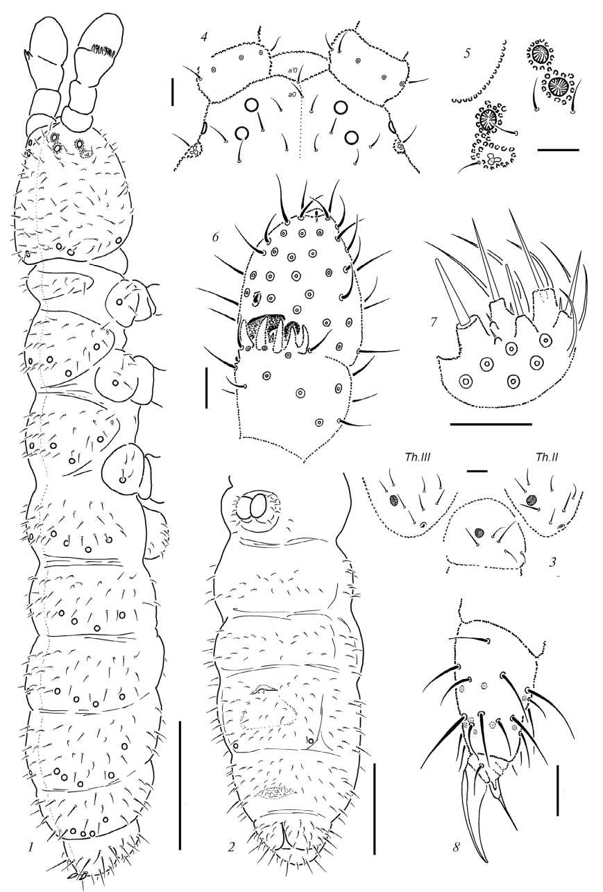 Dorsal setae poorly differentiated into macro- and microsetae, symmetrical in general (Fig. 2, 1). S-setae not distinct. Head probably with two axial unpaired seta a0 and a'0 (?), d0 absent as usual for the genus. Setae p1 on head located slightly above of setae p2. Th. I with 4(5)+4(5) dorsal setae. Lateral ms present only on Th. II and absent on Th. III. Terga of Th. II–Abd. III each with 3–4 pairs of axial setae. On Abd. VI, setae a0 and a2 approximately same in size, setae a1 half as long as a0. Thoracic sterna with 0–1–1 setae each side of ventral line. Ventral chaetotaxy as in Figs 2, 2–3.