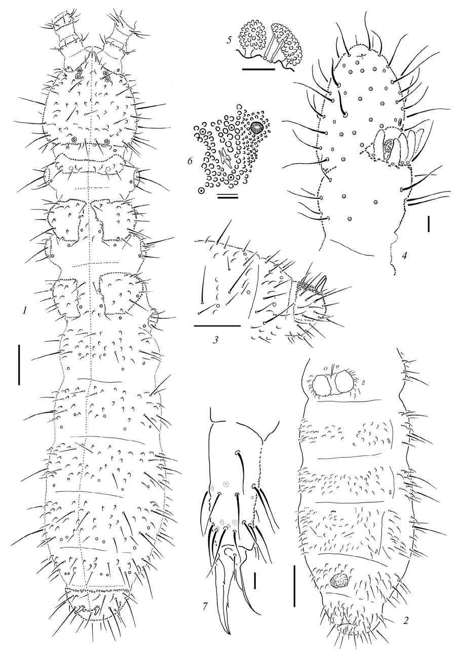 Thoracic sterna with 0–0–1(2) setae each side of ventral line. VT with (6)7+7 proximal and 2+2(1) setae at base. Ventral chaetotaxy as in Fig. 6, 2. Furcal remnant of S-type, usually with 6+6 setae arranged in four irregular rows. Each lateral anal valve with a0 and 2a1 setae, unpaired valve with a0, 2b1, 2b2 (a1 and b0 absent) and 7 setae in c-row.