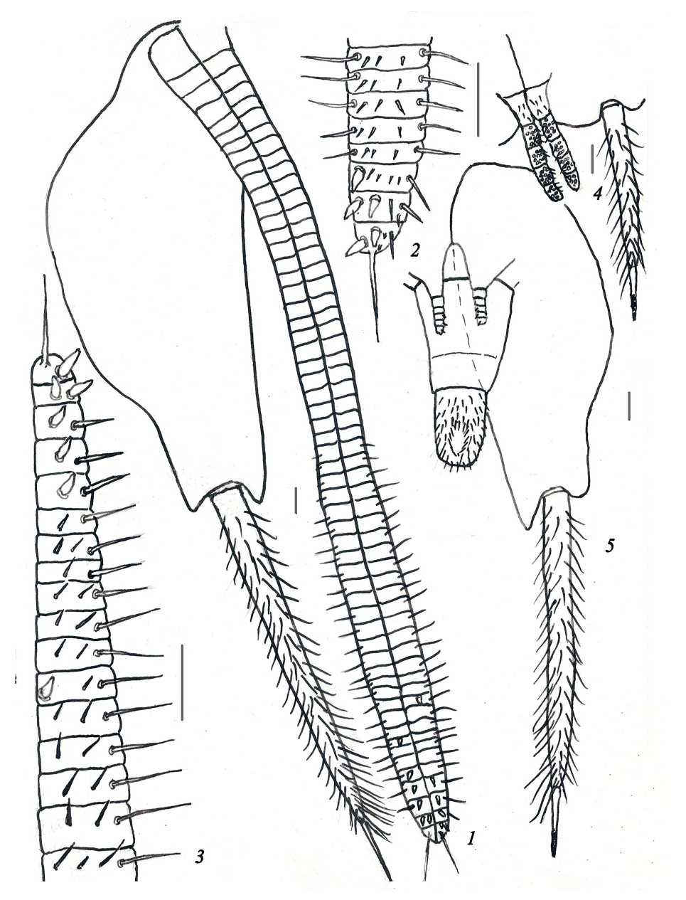 Усики самки в 1.1–1.3, самца в 1.4–1.7 раза длиннее тела. Цепочки дистальной части жгутика самца 12–25-, самки – 10–22-члениковые. Во второй четверти жгутика усика самца имеются 6–9-члениковые цепочки со скошенными краями их первого и последнего члеников (рис. 1, 1). Длина базального членика усика самца в 2.3–2.4, самки в 2.1–2.2 раза больше его ширины. У обоих полов он равномерно покрыт обычными щетинками средней длины и лишен специализированных коротких и сильно пигментированных щетинок. Наличник самца с множеством темных удлиненных щетинок (рис. 1, 2), у самки щетинки на наличнике менее густые, укороченные и бесцветные. Длина церок самца и самки 4.2–4.8 мм. Отношение их длины к длине тела у самца 0.34–0.36, самки 0.32–0.35. Вершина церка имеет два крупных опорных шипа – один более крупный продольный и другой, заметно отклоняющийся от него в сторону (рис. 1, 3). Церки 23–26-члениковые, с двумя–четырьмя рядами чешуек на каждом из члеников. Внутренняя сторона члеников с двумя, реже одной или тремя утолщенными, бесцветными опорными щетинками.