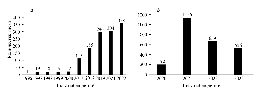 В ходе ежегодных наблюдений первое полноценное размножение северной олуши в российской части Баренцева моря было отмечено в 1996 г. (Krasnov, Barrett, 1997). За истекшие 27 лет российская часть популяции северной олуши выросла, но при этом восточная граница гнездового ареала в Баренцевом море осталась прежней. С момента первого гнездования численность птиц в единственной колонии на о-ве Харлов (Восточный Мурман) постепенно увеличивалась, не испытывая значительных перепадов. Ее динамика представлена на рис. 2a. Вторая колония северной олуши была обнаружена на о-ве Большой Аникеев (Западный Мурман). Ее основание птицами произошло, по-видимому, в 2013–2018 гг., в промежуток между нашими наблюдениями в данном районе. В 2020 г. здесь насчитывалось 192 жилых гнезда. На рис. 2b представлена динамика численности олуш в этой колонии: в 2021 г. численность резко возросла, достигнув уровня 1126 пар, но на следующий, 2022 г., столь же стремительно снизилась до уровня 659 жилых гнезд. Фактически количество жилых гнезд в этом сезоне сократилось на 41.5%. При этом в колонии присутствовали брошенные гнезда, а в ее окрестностях нашли десять погибших взрослых особей. По результатам вскрытия одной из них птица была сильно истощена. На следующий год количество размножающихся птиц в этой колонии уменьшилось еще на 20%. Летом 2023 г. на о-ве Большой Аникеев мы провели учет северных олуш, переболевших птичьим гриппом HPAIV. Для этого был использован предложенный ранее фенотипический индикатор предыдущей инфекции (измененный цвет радужины глаза) (Lane et al., 2023). В итоге мы обнаружили в колонии 13–15% особей, отвечающих данному критерию.
