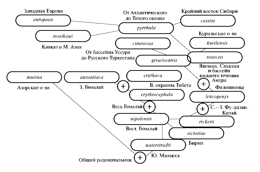 Из трудов, которые составляют основу современного представления о таксономии рода и созданы за последние сто с лишним лет, для анализа я взял две классические работы Бианки (1907) и Фауса (Voous, 1949), которые заслуживают наибольшего внимания при рассмотрении истории расселения снегирей.