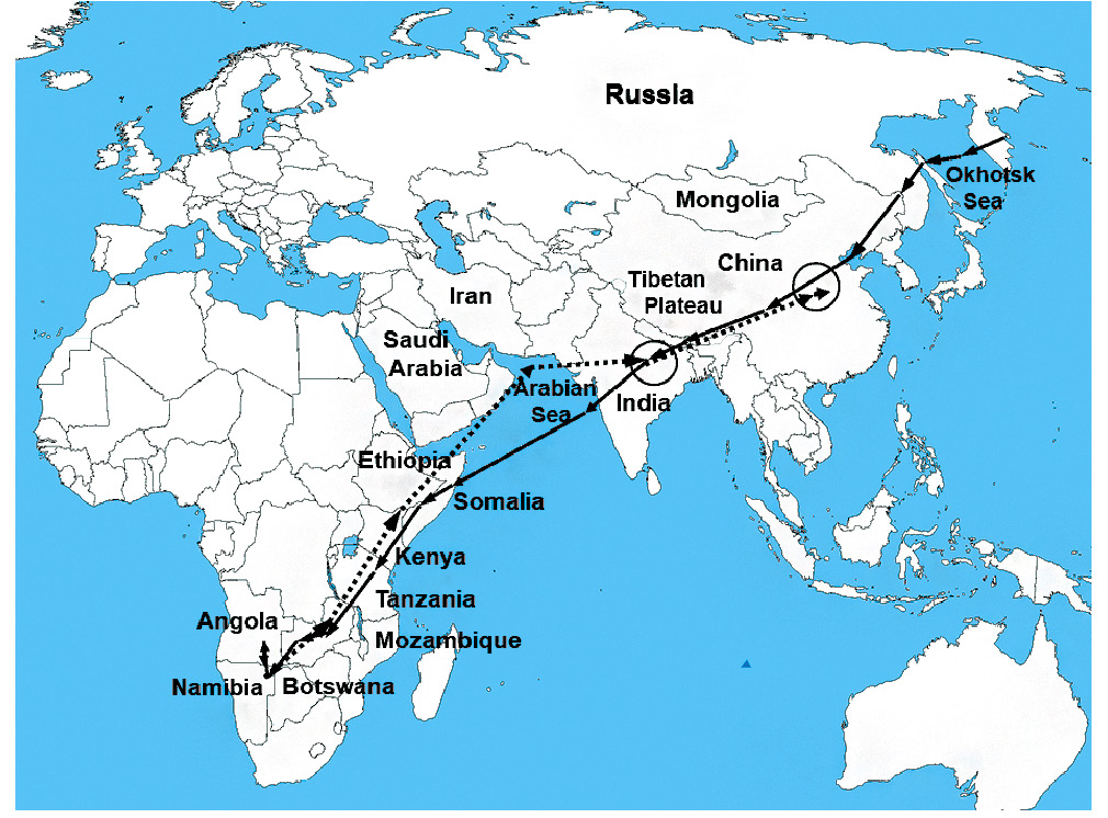 Дальнейшая миграция камчатских кукушек из Сомали проходила через страны восточной Африки – Эфиопию, Кению, Танзанию, Малави, Замбию или Зимбабве, где они задерживались на срок от 2 до 11 суток (табл. 1). Наконец, все особи в декабре – начале января достигли основных районов зимовки в Южной Африке – Ботсваны и Намибии (рис. 1–3, табл. 1). Таким образом, длительность осенней миграции у камчатских кукушек варьировала от 106 до 123 суток, у корейских – от 78 до 109 суток (Lee et al., 2023). При этом у других азиатских популяций обыкновенной кукушки (китайских, монгольских и южнокорейских) районы зимовки располагаются в более восточной части Африки, преимущественно в Танзании и Мозамбике (Lee et al., 2023; сайты https://birdingbeijing.com/beijing-cuckoo-project/; www.movebank.org).