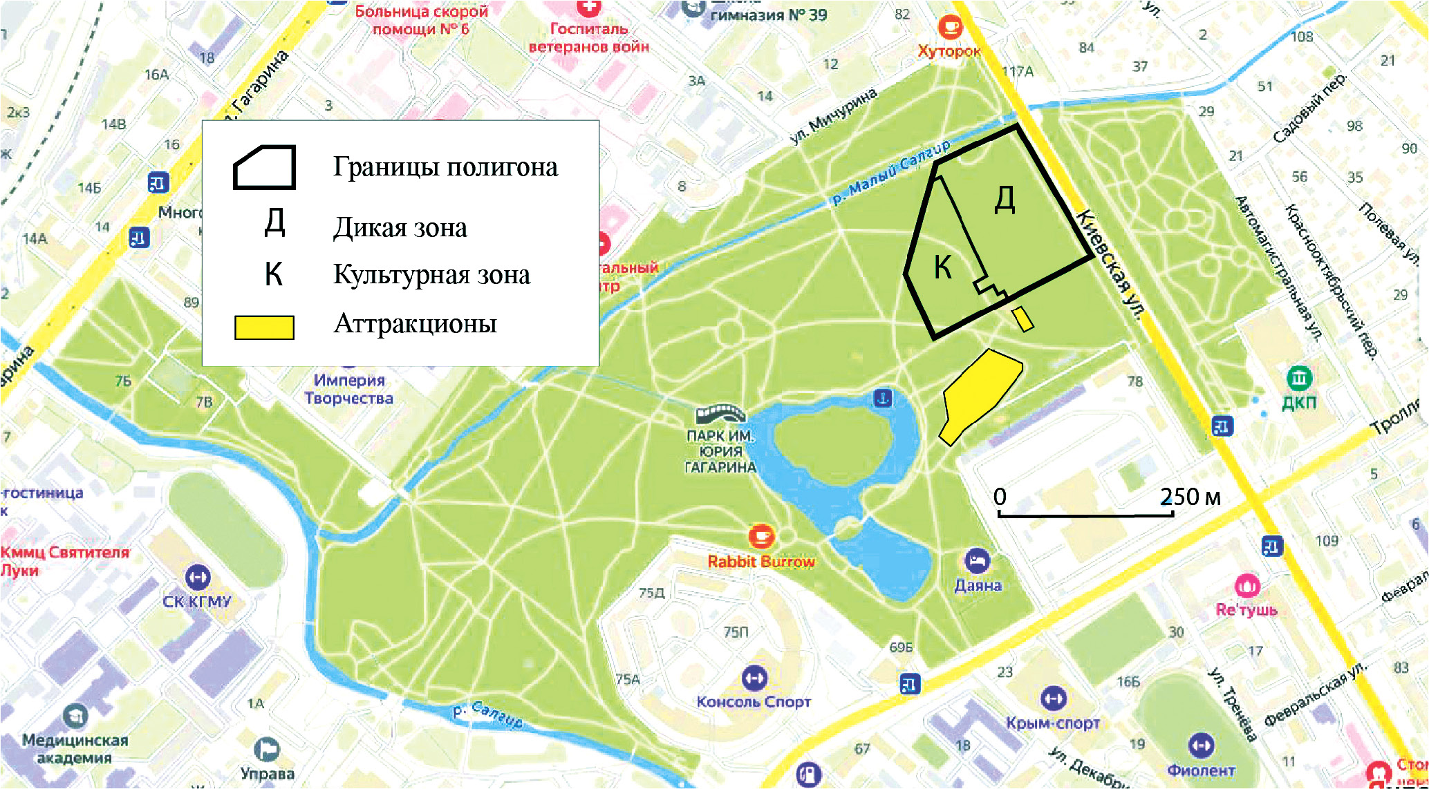 Рис. 1. Расположение исследовательского полигона на территории парка им. Ю. А. Гагарина, г. Симферополь.