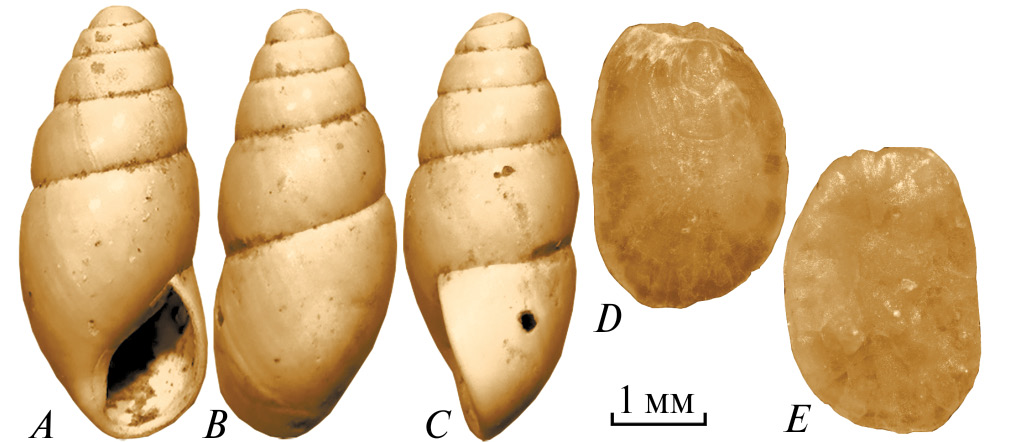Рис. 5. Виды моллюсков рода Cochlicopa и семейства Agriolimacidae из рыхлых отложений позднего неоплейстоцена и голоцена пещеры Тетюхинская (Приморский край, Россия). A–С–Cochlicopa lubrica, ИГ № 389/6701/2, шурф IV, глубина 0.4–0.5 м (A – вид со стороны устья, B – вид со стороны, обратной устью, C – вид сбоку); D–E – Agriolimacidae, ИГ № 389/6689/13, шурф VI, глубина 1.3–1.4 м (D – раковина со стороны нуклеуса, E – раковина с обратной стороны от нуклеуса). ИГ № 389/6701/2 – регистрационный номер образца.