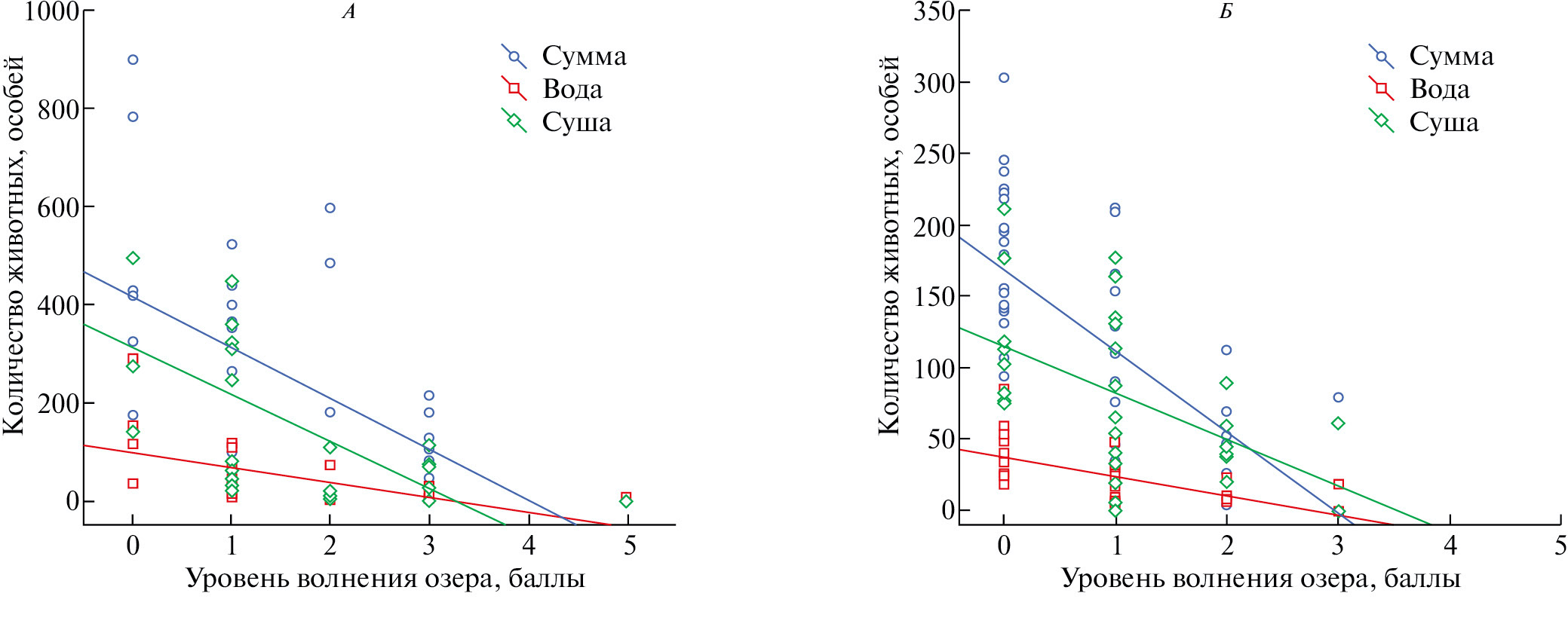 Рис. 4. Количество нерп на о-ве Тонкий на суше и в воде в зависимости от уровня волнения озера по данным визуальных учетов. Цветными линиями отмечены линии тренда. А – 2020 г., Б – 2021 г.