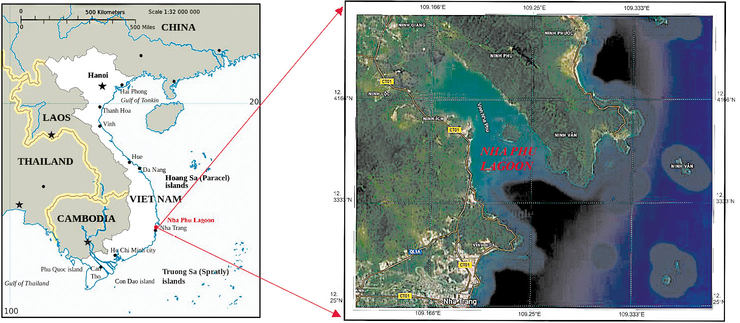 Nha Phu Lagoon (Fig. 1) is situated to the north of Nha Trang City, in Khanh Hoa Province. Spanning an approximate area of 4,500 hectares (Strehlow, Peter, 2004), this lagoon is protected by the Hon Ho Mountain range and is accompanied by small islands such as Hon Hoai, Hon Sam, Hon Thi and Hon Khi Island. It is recognized as one of the prominent sites for development and aquaculture in Khanh Hoa Province. Shrimp ponds can be found surrounding the lagoon, while cages on the water surface are primarily used for farming fish and molluscs.