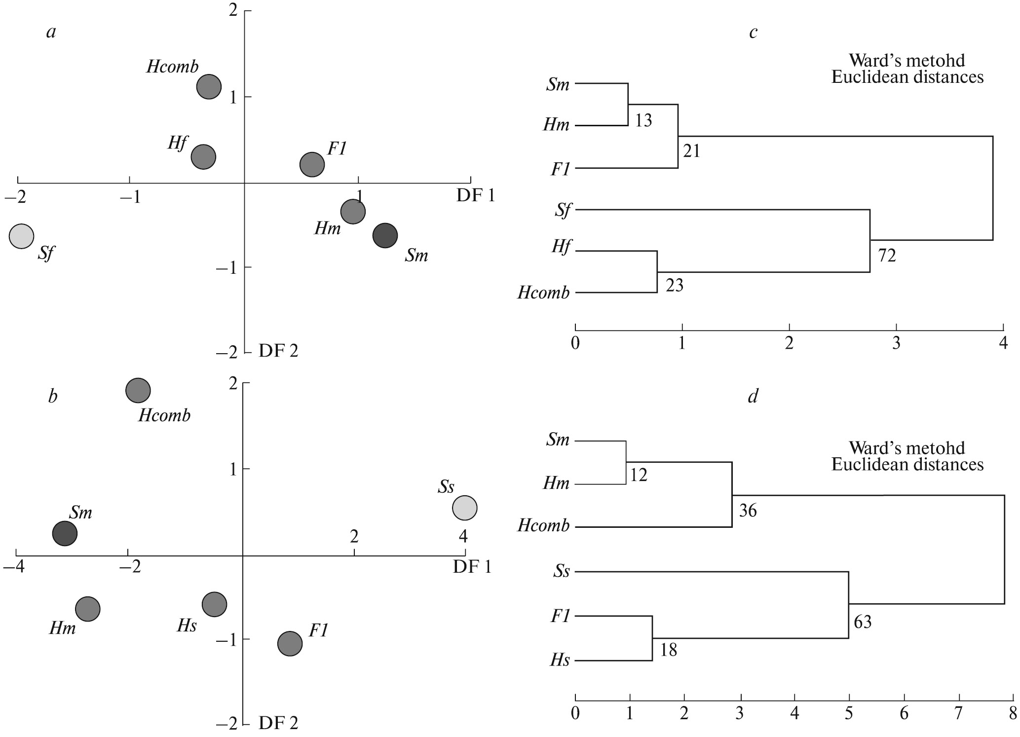 Предварительно сформированные по генетическому статусу группы (выборки) гибридных особей была верифицированы в ходе проведения пошагового дискриминантного анализа по результатам классификации особей по значениям дискриминантных функций. Для гибридов большого и желтого сусликов совпадение выборок и результатов классификации для гибридов F1 составило 66.7% (6 из 9 особей, 1 – Sf, 1 – Hm, 1 – Hcomb), для гибридов Hm – 75.0% (6 из 8 особей, 1 – F1), для гибридов Hf – 77.8% (7 из 9 особей, 1 – Sf, 1 – Hcomb), а для гибридов Hcomb – 55.6% (5 из 9 особей, 2 – F1, 2 – Hf). Для большого и крапчатого суслика были получены более высокие значения: для гибридов F1 – 90.9% (10 из 11 особей, 1 – Hs), для гибридов Hm – 100.0% (3 из 3 особей), для гибридов Hs – 33.3% (2 из 6 особей, 1 – Sm, 3 – F1), а для гибридов Hcomb – 50.0% (2 из 4 особей, 1 – Sm, 1 – F1).