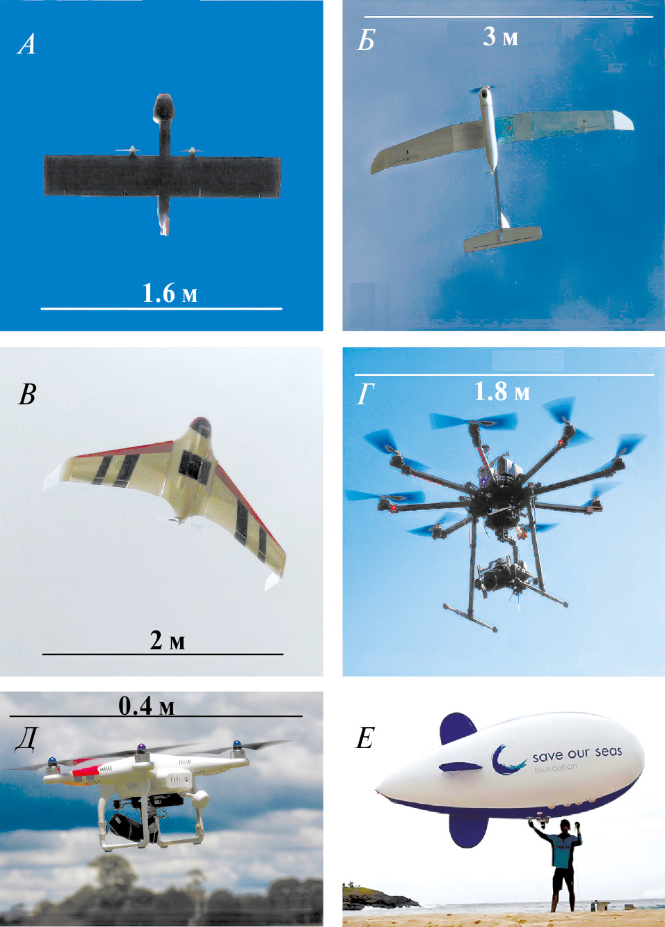 Рис. 1. Модели БПЛА, используемых для исследования животных: A – с фиксированным крылом Avian-P, Б – с неподвижным крылом Skylark II, В – с фиксированным крылом и толкающим винтом Topodrone-100, Г – многороторного (октокоптер) типа Kraken-130, Д – многороторного (квадрокоптер) типа Phantom, Е – типа дирижабль Happy Win HWEA5202. Иллюстрации находятся под открытой лицензией на повторное использование: A – Г – по: McEvoy et al., 2016; Е – по: Adams et al., 2020