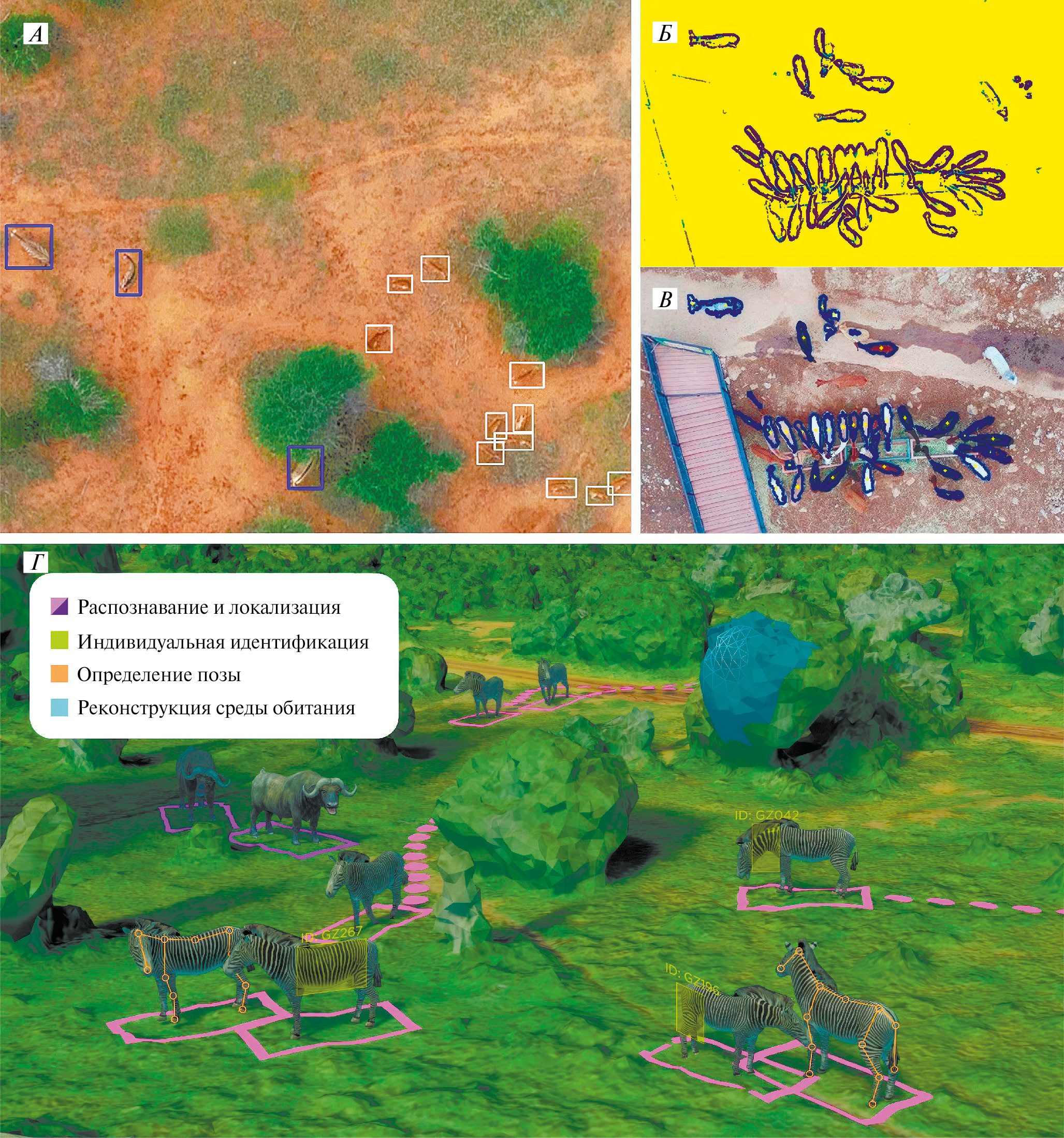 Рис. 3. Использование алгоритмов компьютерного зрения для анализа материалов, полученных с БПЛА. A – одновременное автоматическое определение и трекинг двух видов копытных с визуализированными ограничительными рамками объектов (bbox) для двух видеокадров с использованием обученных моделей (зебры – синий цвет, импалы – белый цвет). Пример автоматической детекции животных на сложном фоне (Б) с применением функции оператор Собеля для обнаружения границ и (В) их отрисовки на исходное изображение. Г – Сводная инфографика, демонстрирующая современные возможности использования компьютерного зрения для: распознавания видовой принадлежности млекопитающих их положения в пространстве (фиолетовый цвет), отслеживания их перемещений (розовый цвет), индивидуальной идентификации особей (зеленый цвет), категоризации поз тела (оранжевый цвет), реконструкции местообитаний, в том числе поврежденных (голубой цвет). Иллюстрации находятся под открытой лицензией на повторное использование: A – Koger et al., 2023; Б, В – Lee et al., 2021; Г – Tuia et al., 2022