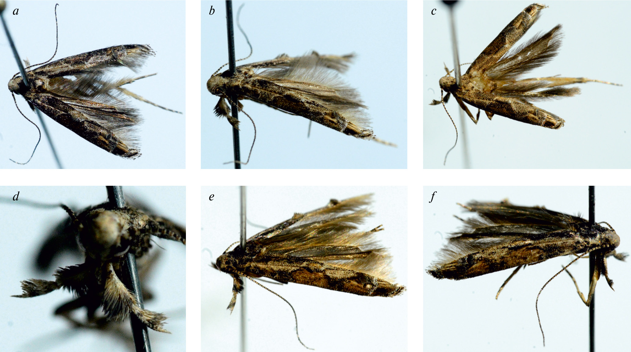 Описание. Бабочка (рис. 1д, 1е). Длина переднего крыла 8.0 мм. Голова дымчатая, вокруг глаз чешуйки дымчатые в проксимальной части и черноватые с дымчатой вершиной в дистальной. Базальный членик усиков черноватобурый со светло-дымчатыми перевязями в средней части и вершиной. На жгутике усиков чередуются бурые и бежевые, с буроватым пятном сверху, членики. Базальный членик нижнегубных щупиков очень короткий, с внешней стороны бурый, с внутренней – бежевый; средний членик большой, широкий, черновато-бурый с косыми поперечными размытыми бежевыми перевязями в базальной части и дистальнее середины, снизу щупика пучок из длинностебельчатых чешуек – бежевых в базальной части и черных в дистальной; вершинный членик короче среднего, сверху, кроме вершинной части, со щеткой длинностебельчатых чешуек, дымчатый с интенсивным буроватым затемнением и широкой черноватой перевязью в средней части. Грудь, патагии и тегулы в основном черные с вкраплением черных чешуек с беловатой вершиной, внешний край тегул бежевый. Переднее крыло между радиальным и кубитальным стволами жилок бежевое с темно-песочным затемнением, от костального края до радиального ствола и от кубитального ствола до заднего края черноватое с вкраплением черноватых чешуек с белой вершиной. Вдоль костального края крыла два нечетких черных базальных пятна с размытым беловатым ободком и два больших ромбовидных бурых пятна в средней и дистальной частях крыла с размытым черным ободком. Серебристая внешняя перевязь отделяет вершинную часть крыла, она черноватобурая от костального края до середины крыла и бежевая с тремя продольными бурыми штрихами от середины до заднего края крыла. Внешний край крыла с серебристым ободком и черновато-бурой маргинальной линией. Кроющие чешуйки бахромки на вершине крыла бежевые в проксимальной части и коричнево-бурые в дистальной, подстилающие чешуйки дымчатые в проксимальной части и черные с дымчатой вершиной в дистальной. Бахромка на заднем крае крыла темно-дымчатая с бежевым оттенком. Заднее крыло черноватое, бахромка темно-дымчатая с бежевым оттенком. Ноги дымчатые с интенсивным черным затемнением. На голенях передних ног беловатые полоски в базальной и средней части и беловатая вершина, снизу пучок удлиненных чешуек. На голенях средних ног воротнички из удлиненных чешуек дымчатого цвета в средней части и на вершине, сверху голеней в проксимальной части щетка из удлиненных чешуек. Голени задних ног сверху со щеткой волосовидных дымчатых чешуек. Членики лапок всех ног с беловатой вершиной.