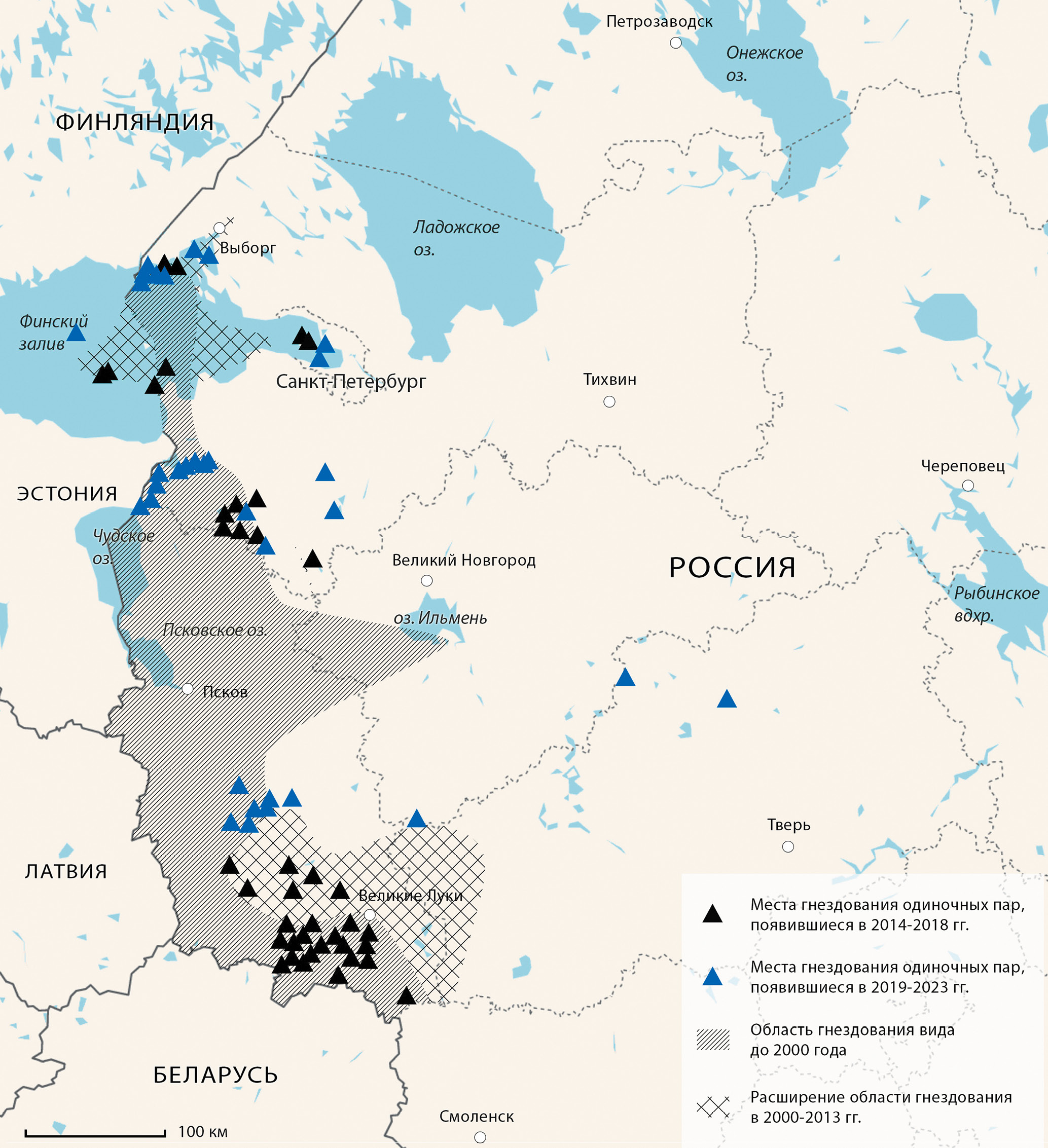 Ленинградская область. В 2014–2023 гг. процесс освоения новых мест размножения в регионе существенно ускорился (рис. 3). Можно выделить две особенности этого процесса: уплотнение гнездовой группировки в пределах ранее занятого пространства и дальнейшее расширение ареала. Уплотнение гнездящейся группировки было наиболее заметно в двух районах: на юго-западе Ленинградской области и в шхерах у северного берега Финского залива (рис. 3).