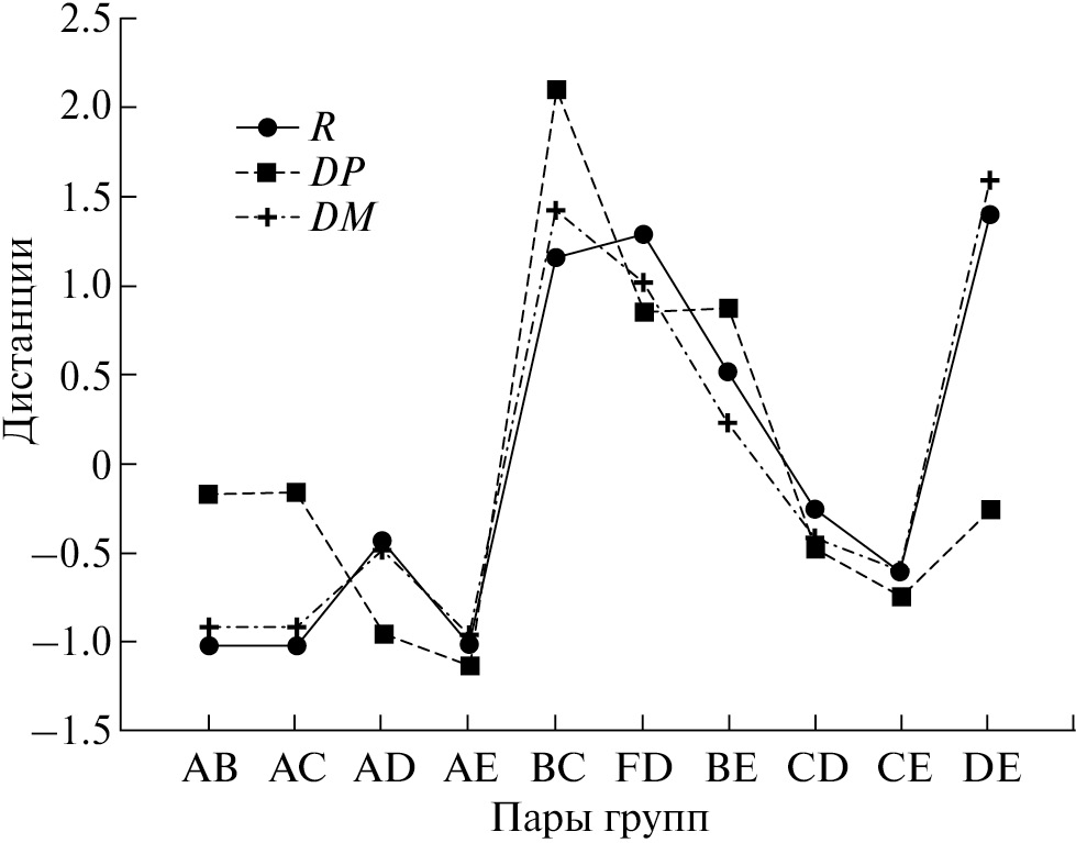 Количественная оценка сходственных отношений с помощью трех разных коэффициентов дает следующие результаты (табл. 4). В каждом из сравнений группа А, в которой морфотипы распределены с одинаковой частотой, оказывается минимально отличной и при этом равно удаленной от прочих групп. В парах (В, С) и (D, Е), в которых частотные распределения морфотипов противоположны (правая и левая скошенность в первой паре, бимодальность и унимодальность во второй), составляющие их группы наиболее отличны друг от друга. Распределение стандартизованных значений всех трех дистанций очень сходно (рис. 3), причем R и DM распределены практически идентично, распределение DР более специфично (за счет иной оценки отношений группы А с прочими): корреляция первых двух дистанций 0.98, корреляция третьей с ними 0.68.